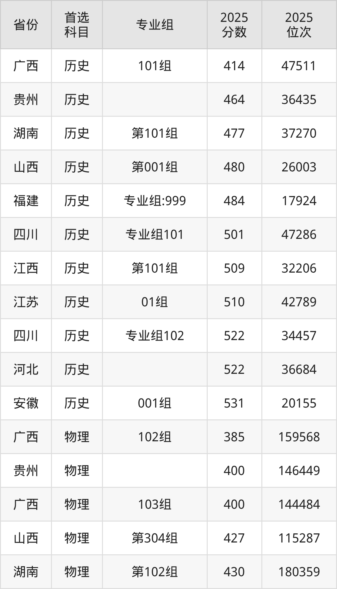 历史类最低分对应地区为广西(101组),录取位次为47511,超本科线12分;最高分对应地区为安徽(001组),录取位次为20155,超本科线54分。