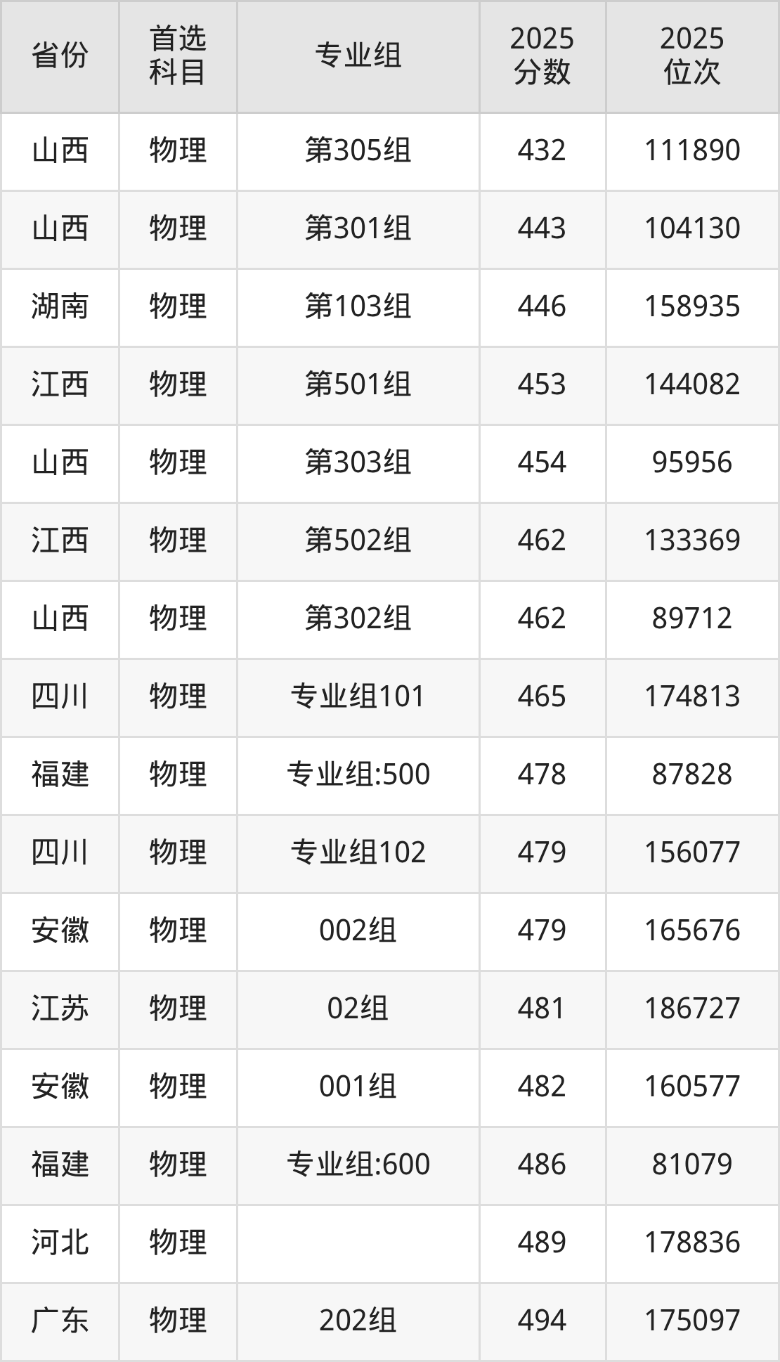 物理类最低分对应地区为广西(102组),录取位次为159568,超本科线15分;最高分对应地区为江苏(03组),录取位次为148936,超本科线47分。