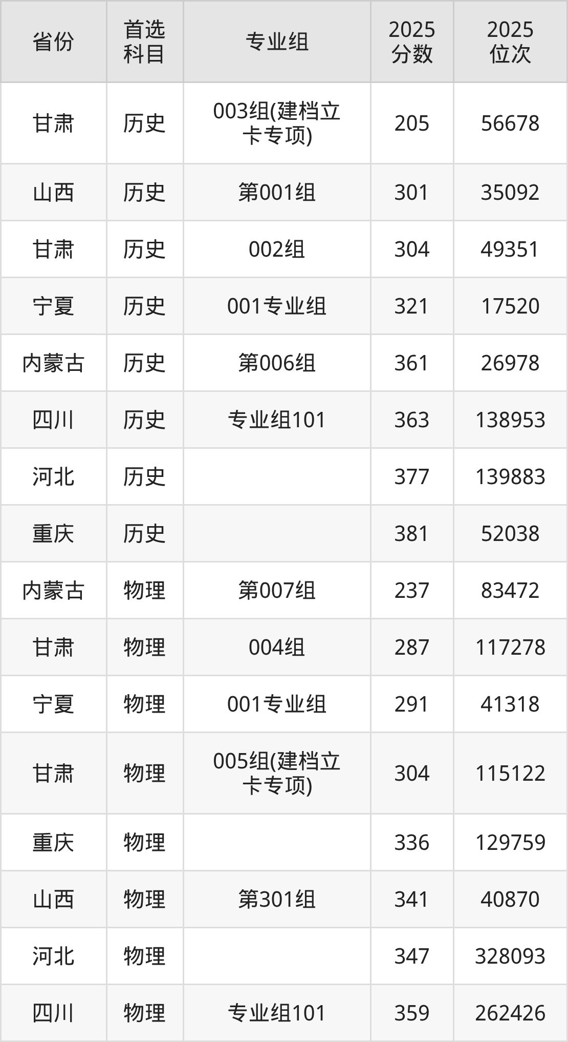 为了方便各地区考生们查看甘肃建筑职业技术学院的录取情况,本文也整理出2025年甘肃建筑职业技术学院在全国各省的录取分数线,供参考。