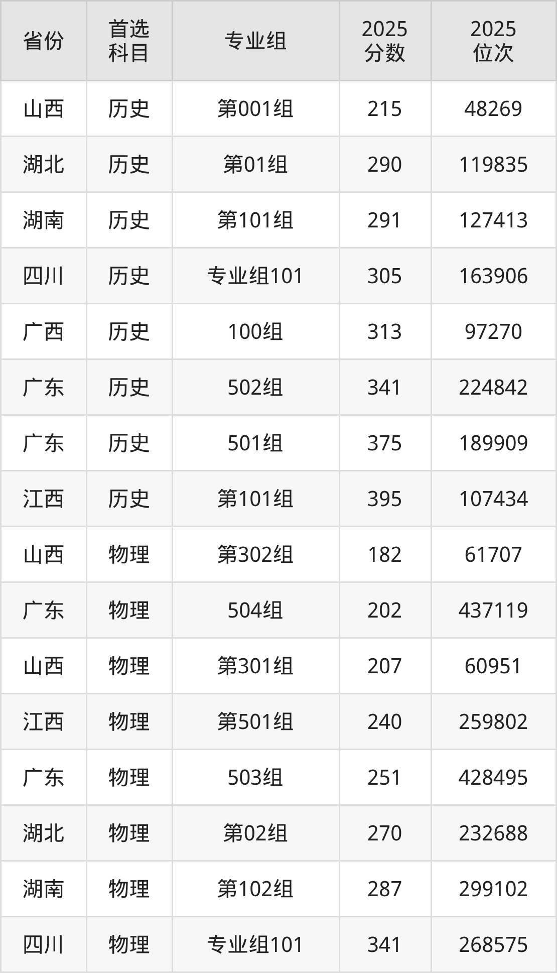 历史类最低分对应地区为山西(第001组),录取位次为48269,超专科线115分;最高分对应地区为江西(第101组),录取位次为107434,超专科线105分。