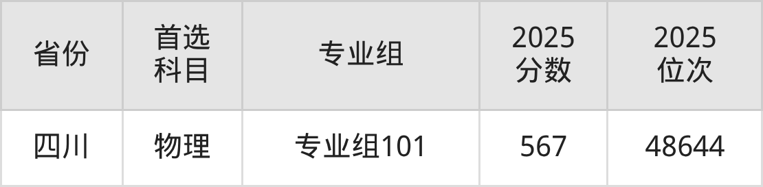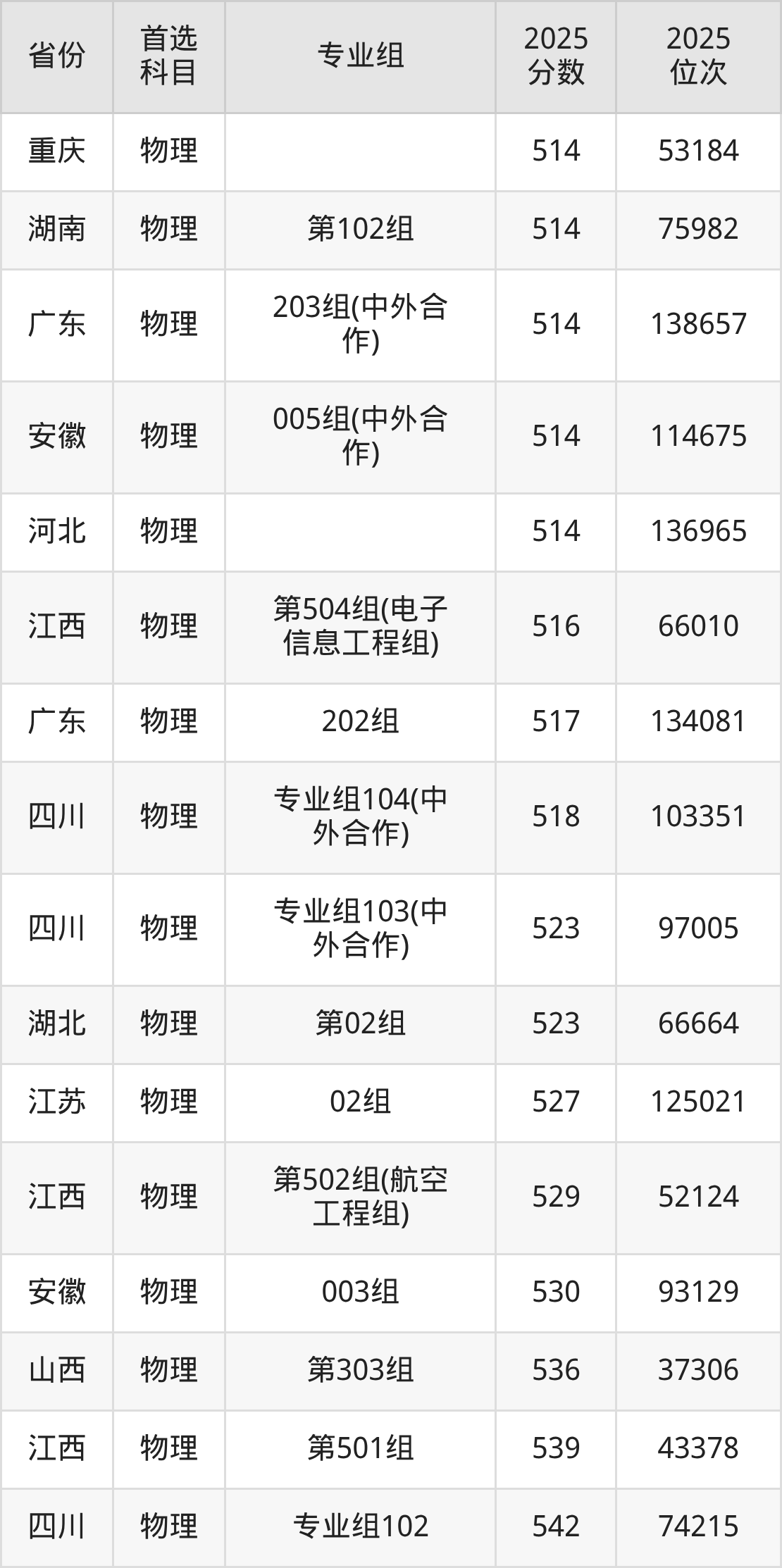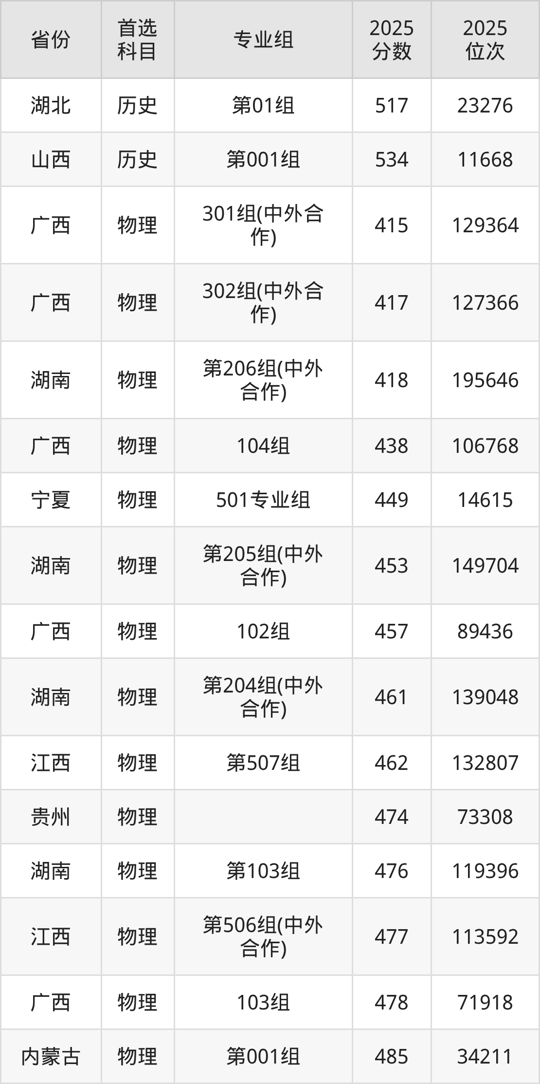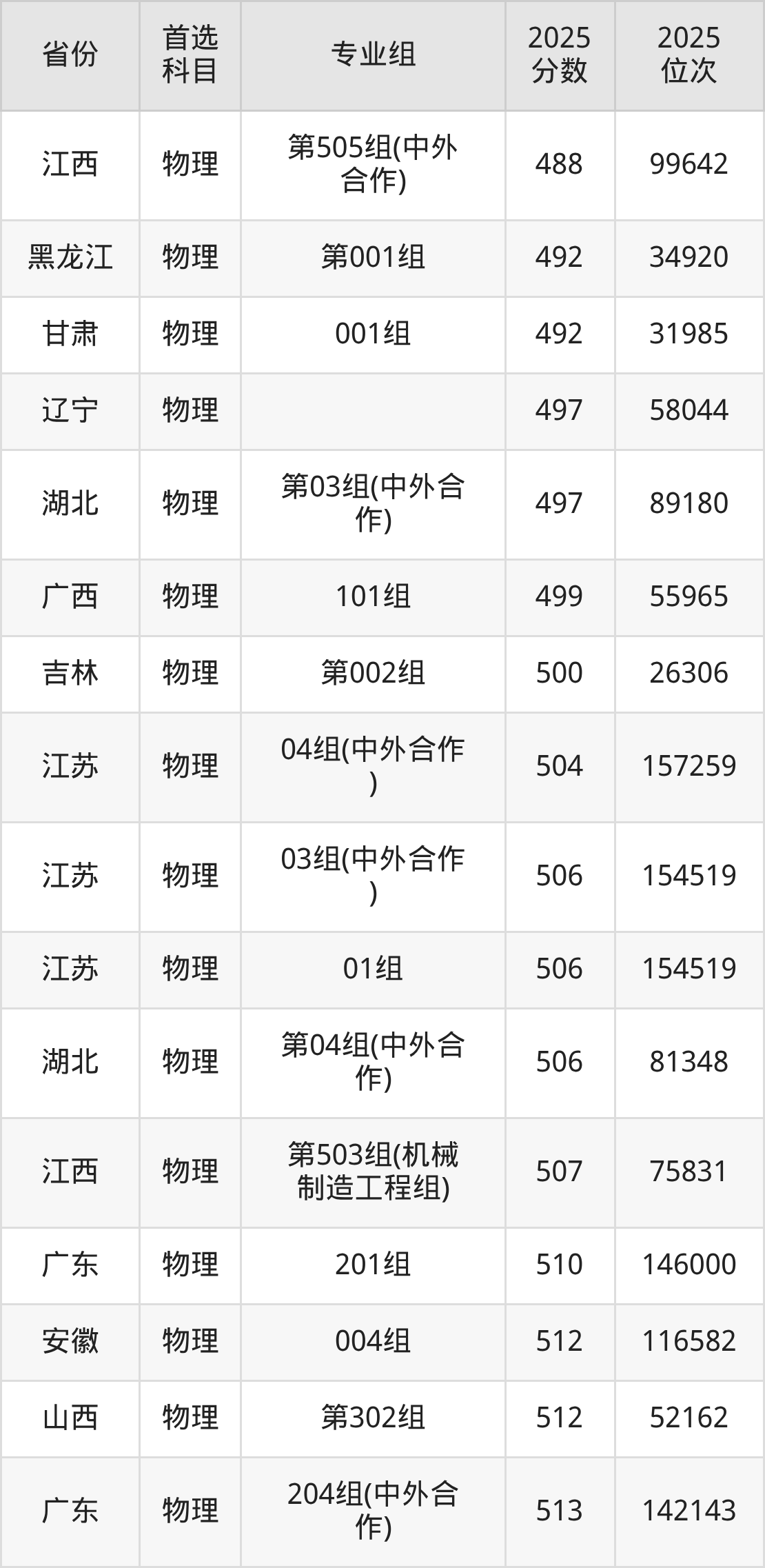 物理类最低分对应地区为广西(301组(中外合作)),录取位次为129364,超本科线45分;最高分对应地区为四川(专业组101),录取位次为48644,超本科B129分。