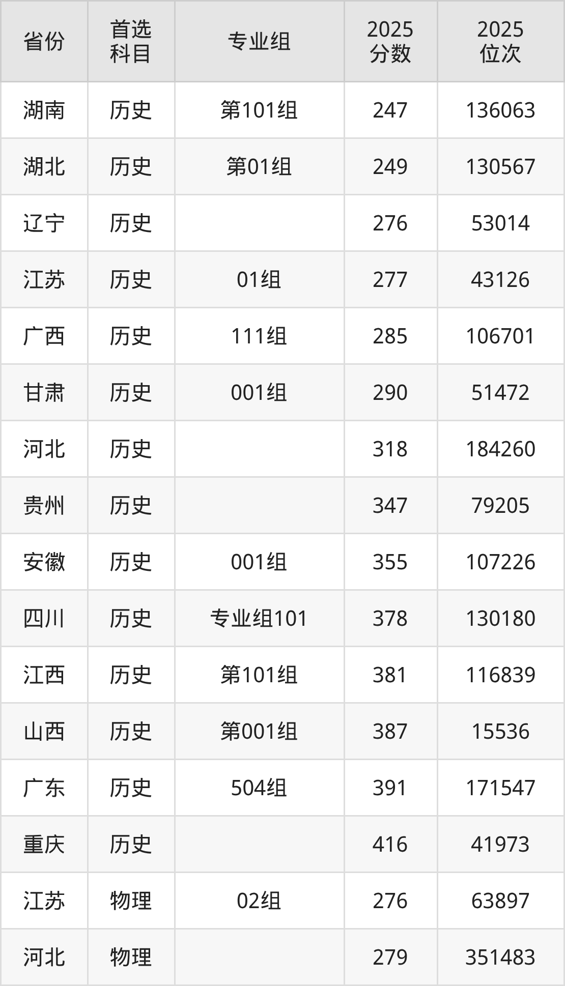 历史类最低分对应地区为湖南(第101组),录取位次为136063,超专科线47分;最高分对应地区为重庆,录取位次为41973,超专科线236分。