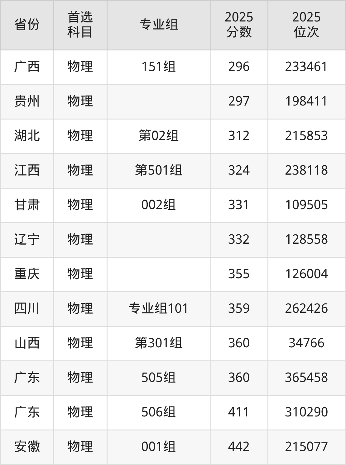 物理类最低分对应地区为江苏(02组),录取位次为63897,超专科线56分;最高分对应地区为安徽(001组),录取位次为215077,超专科线242分。