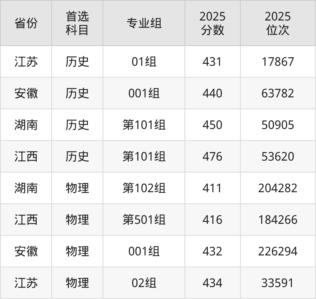 历史类最低分对应地区为江苏(01组),录取位次为17867,超专科线211分;最高分对应地区为江西(第101组),录取位次为53620,超专科线186分。