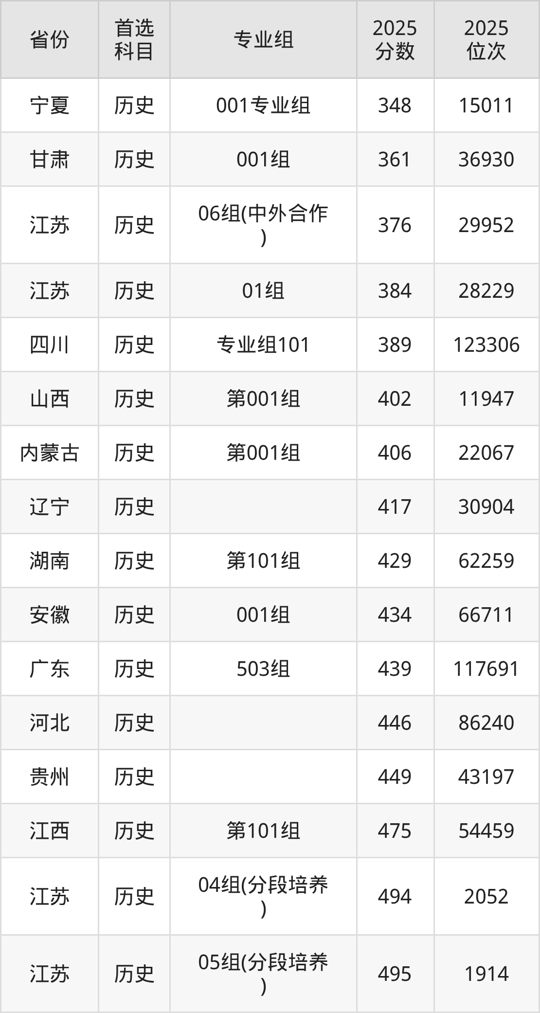 历史类:01组384分、28229名,02组(分段培养)500分、1373名,03组(分段培养)508分、910名,04组(分段培养)494分、2052名,05组(分段培养)495分、1914名,06组(中外合作)376分、29952名;