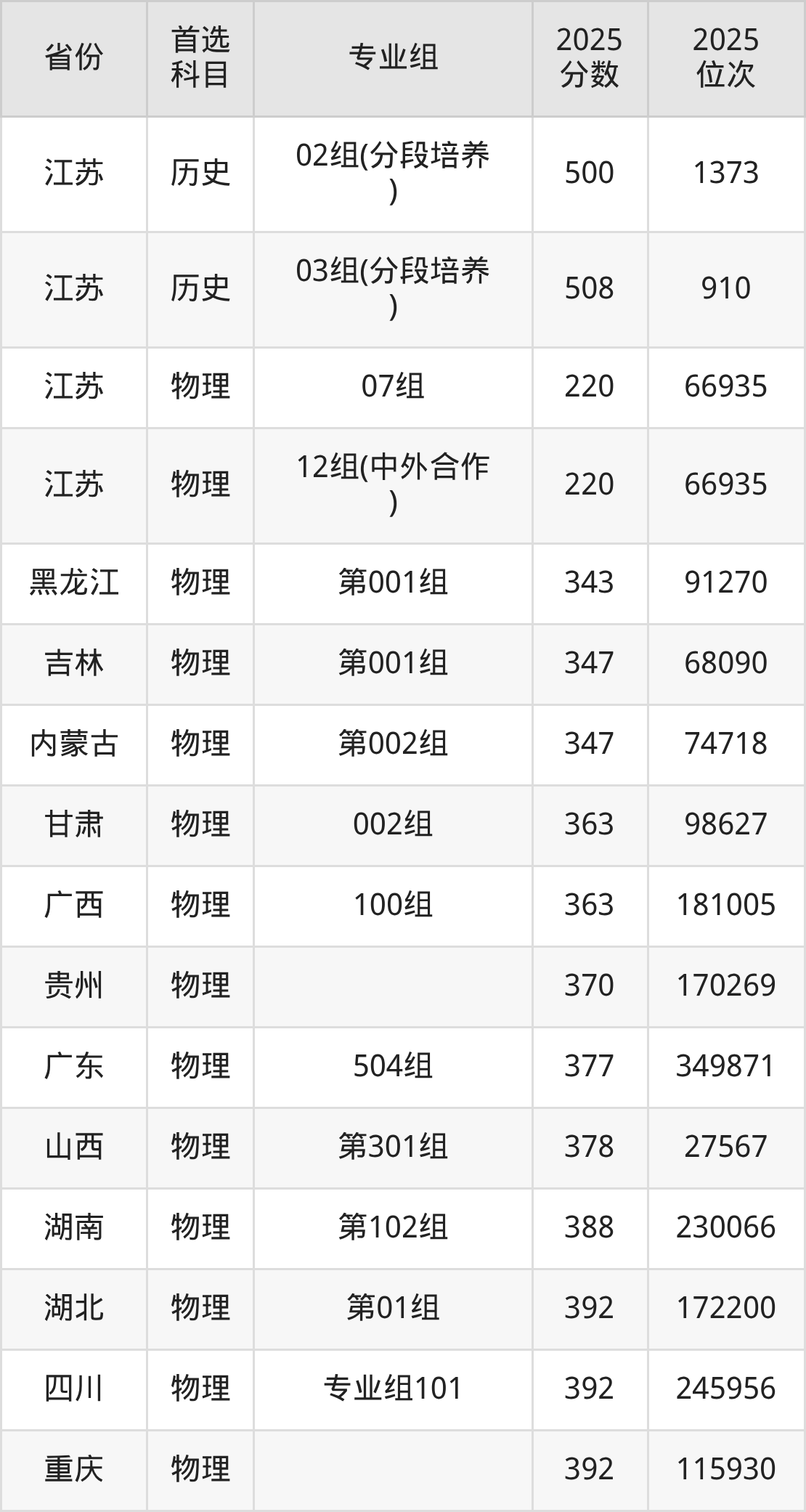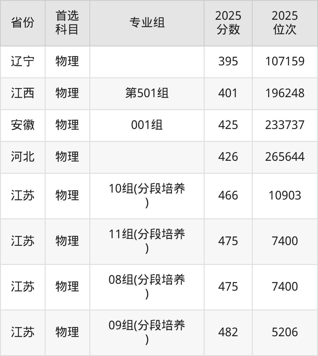 物理类:06组402分、45453名,07组(分段培养)464分、7656名,08组(分段培养)475分、3838名,09组(分段培养)461分、9178名,10组(中外合作)395分、47852名;