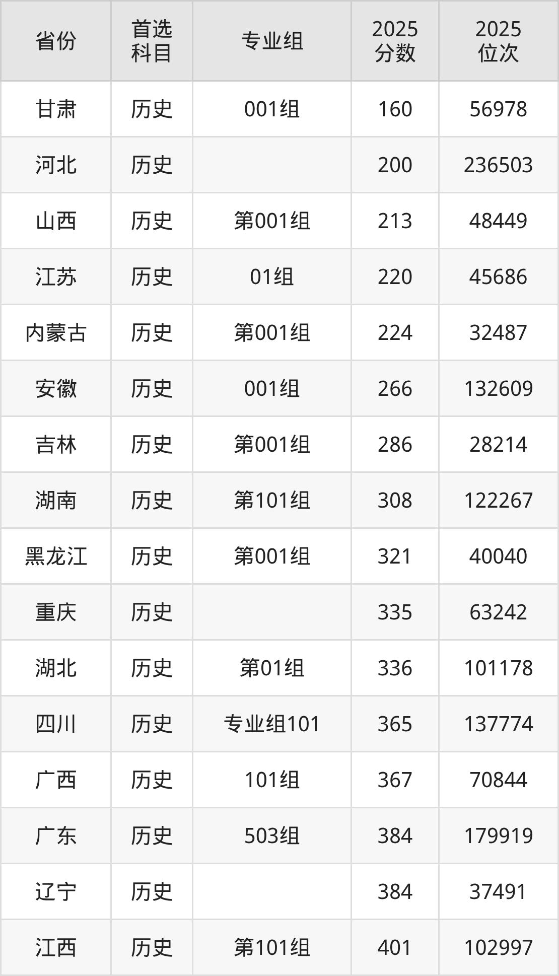 历史类最低分对应地区为甘肃(001组),录取位次为56978;最高分对应地区为贵州,录取位次为61849,超专科线224分。