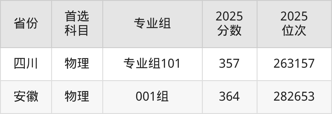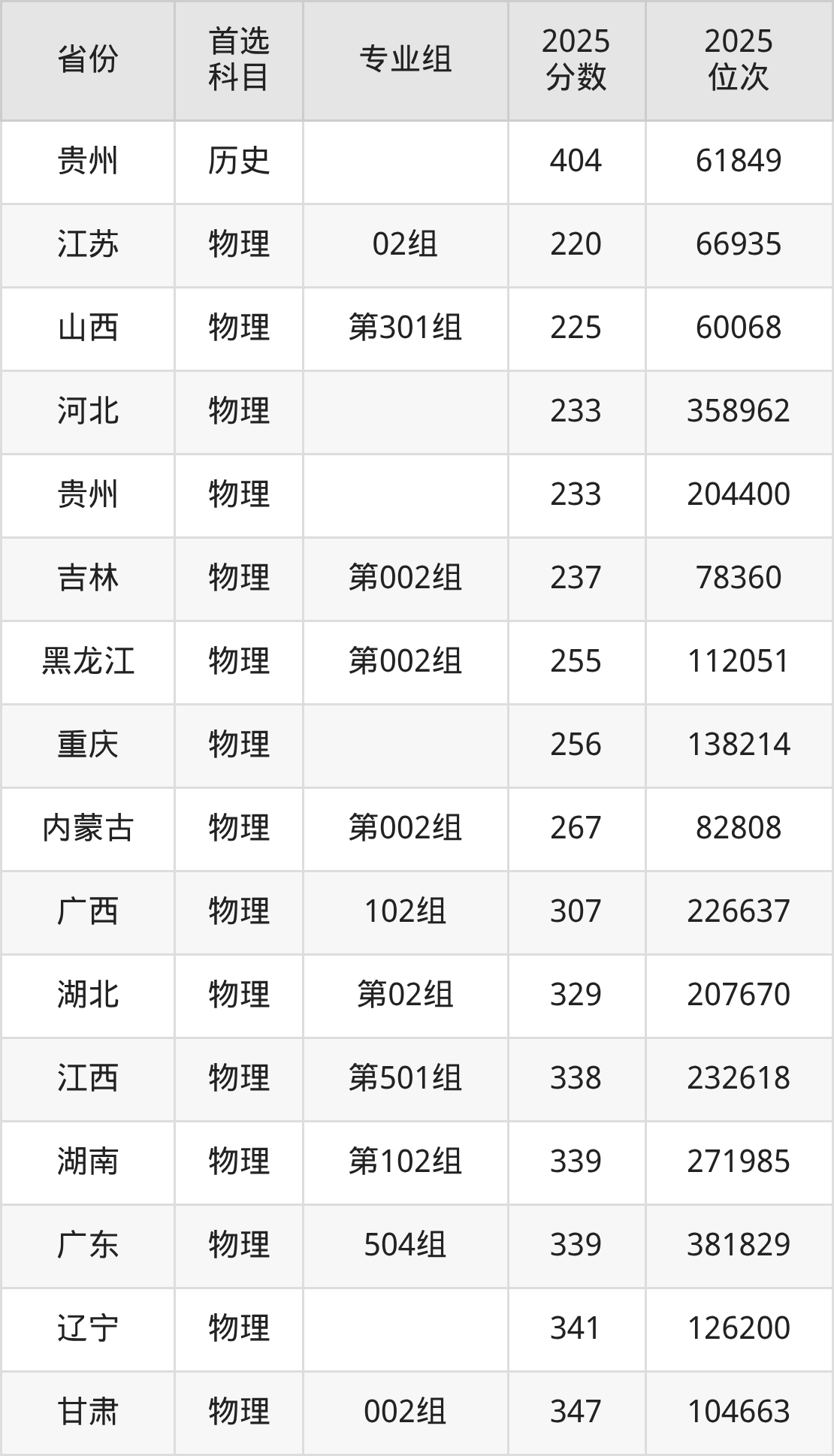 物理类最低分对应地区为江苏(02组),录取位次为66935;最高分对应地区为安徽(001组),录取位次为282653,超专科线164分。