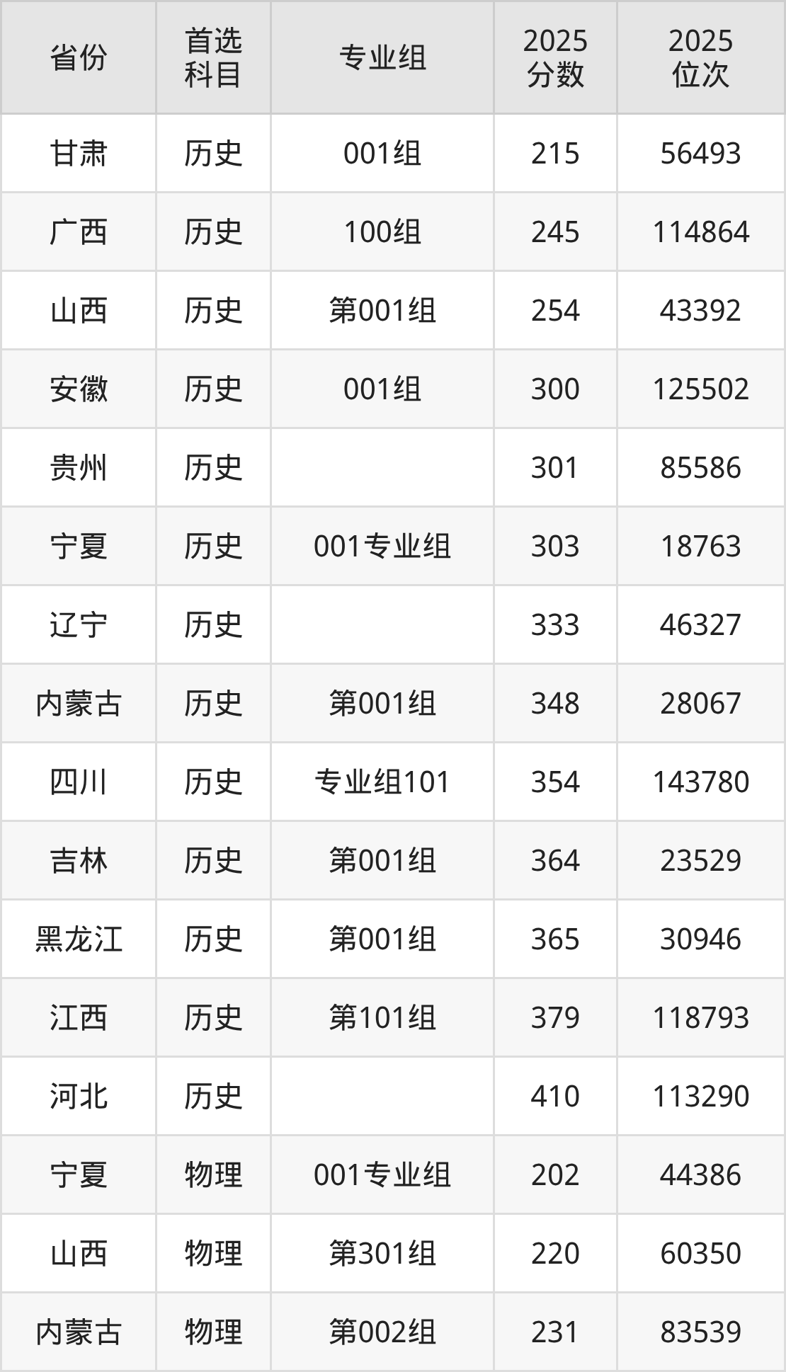 历史类最低分对应地区为甘肃(001组),录取位次为56493,超专科线55分;最高分对应地区为河北,录取位次为113290。