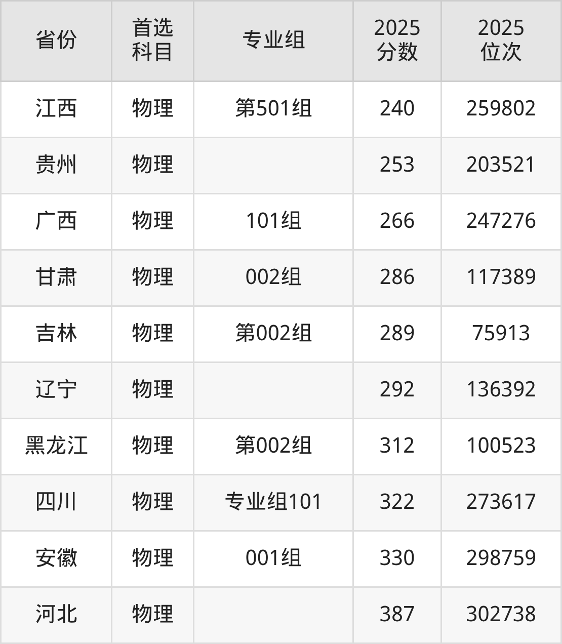 物理类最低分对应地区为宁夏(001专业组),录取位次为44386,超专科线52分;最高分对应地区为河北,录取位次为302738,超专科线187分。