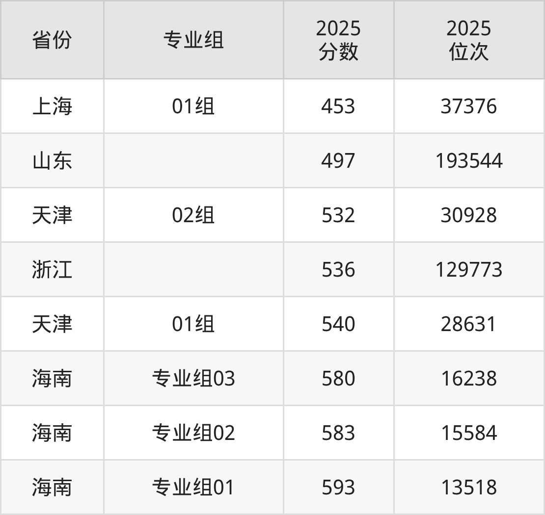 最低分对应地区为上海(01组),录取位次为37376,超本科线51分;最高分对应地区为海南(专业组01),录取位次为13518,超本科线113分。