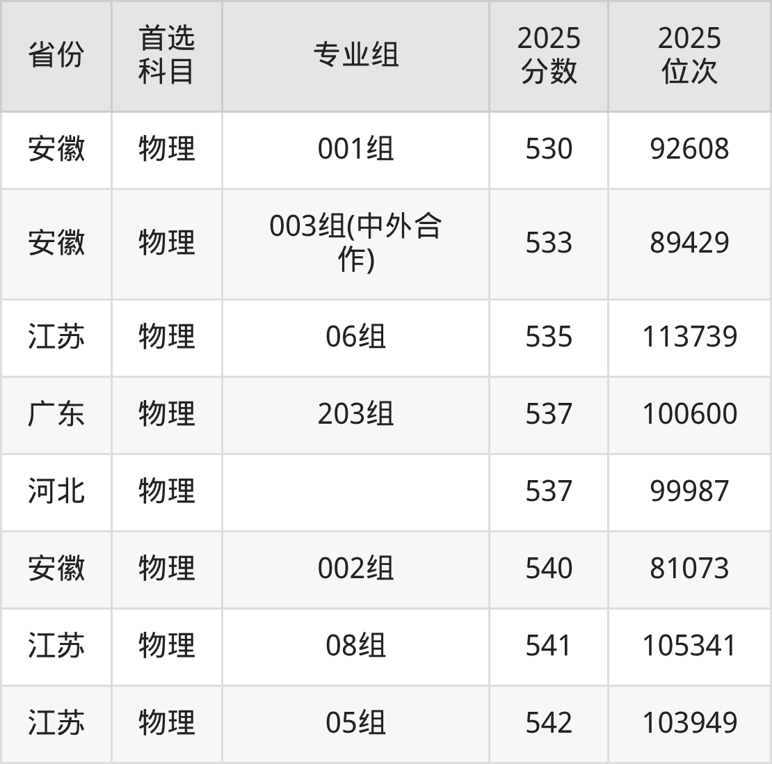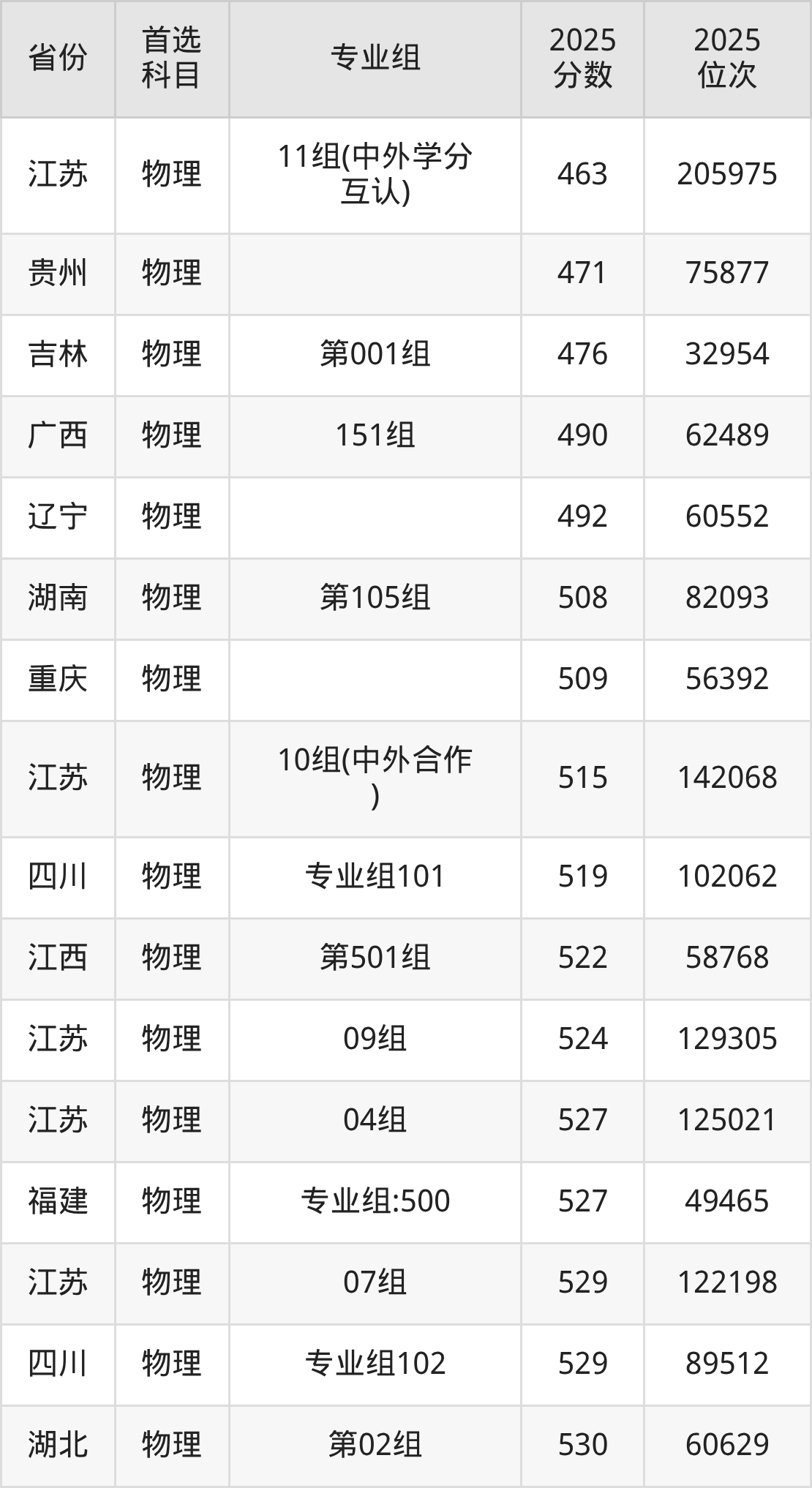 物理类:04组527分、125021名,05组542分、103949名,06组535分、113739名,07组529分、122198名,08组541分、105341名,09组524分、129305名,10组(中外合作)515分、142068名,11组(中外学分互认)463分、205975名,12组(中外学分互认)463分、205975名;