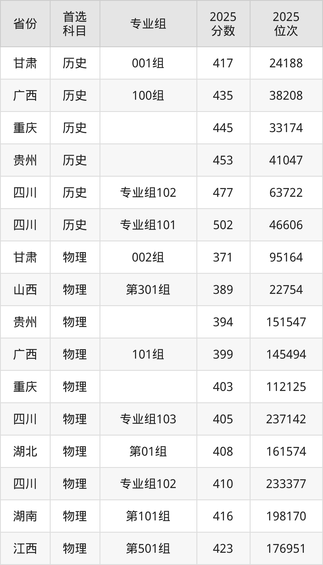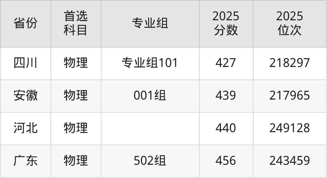 物理类最低分对应地区为甘肃(002组),录取位次为95164,超专科线191分;最高分对应地区为广东(502组),录取位次为243459,超专科线256分。