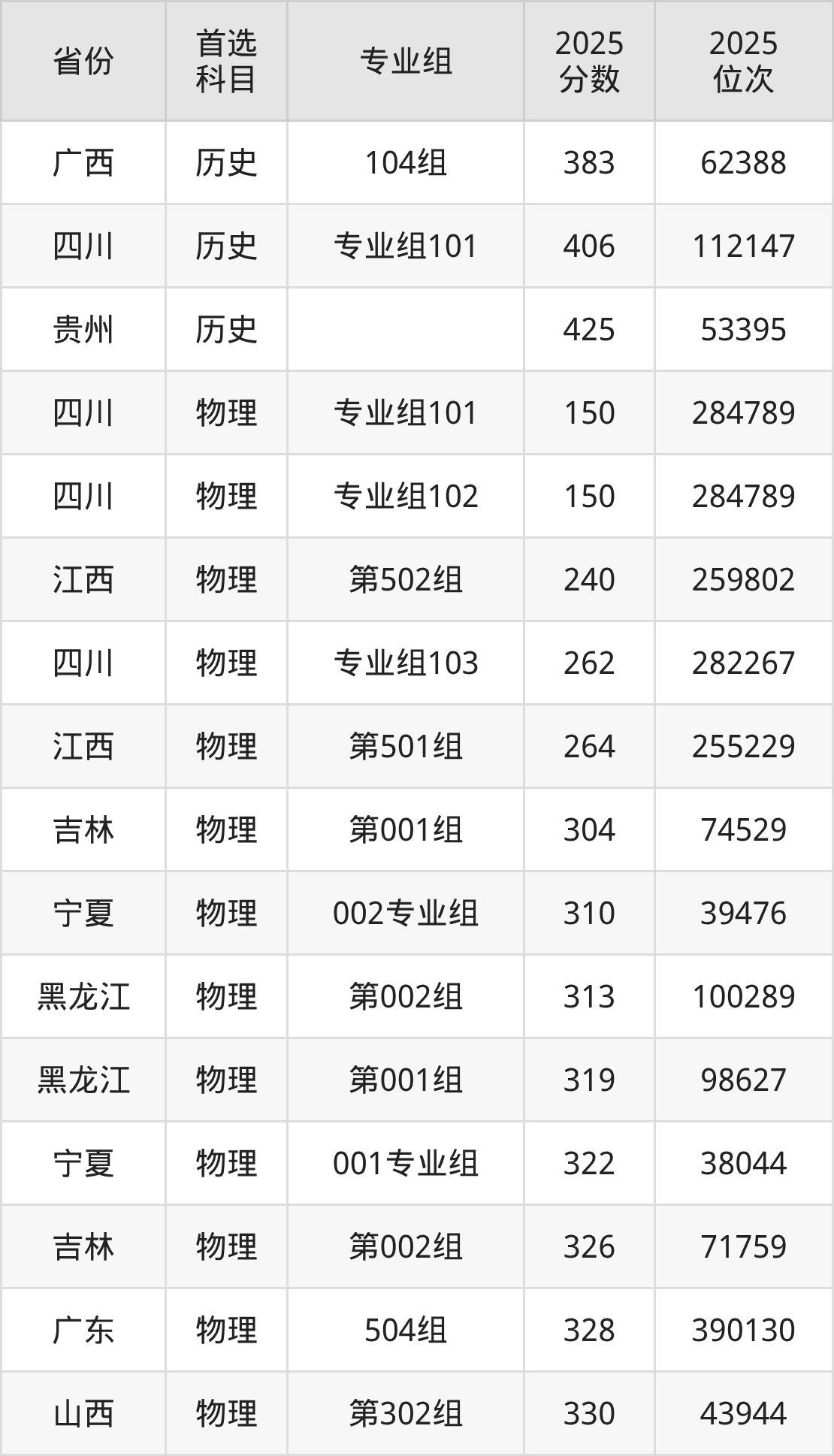 历史类最低分对应地区为广西(104组),录取位次为62388,超专科线183分;最高分对应地区为贵州,录取位次为53395,超专科线245分。