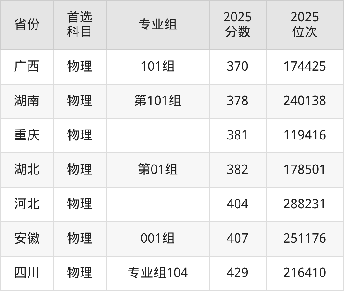 物理类最低分对应地区为四川(专业组101),录取位次为284789;最高分对应地区为四川(专业组104),录取位次为216410,超专科线279分。