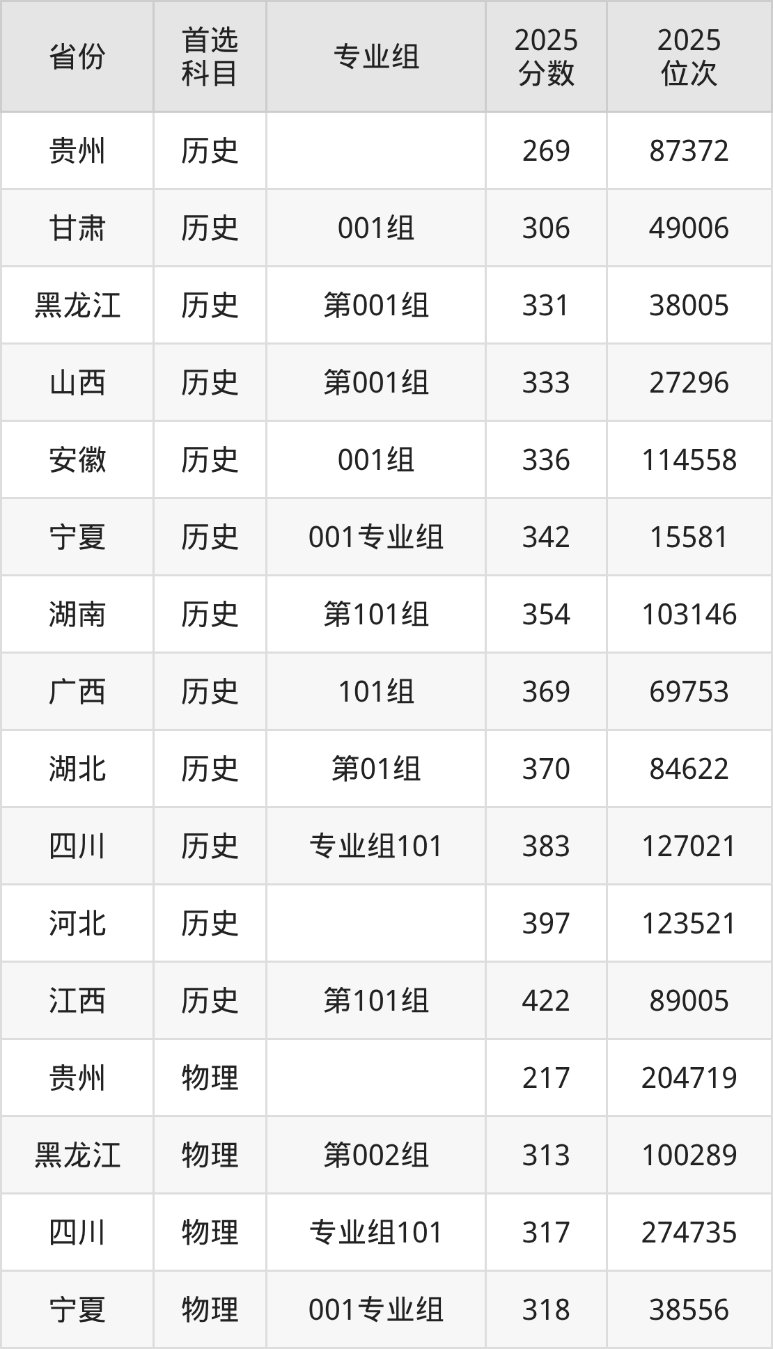 历史类最低分对应地区为贵州,录取位次为87372,超专科线89分;最高分对应地区为江西(第101组),录取位次为89005,超专科线132分。