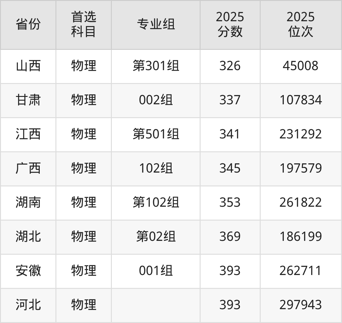 物理类最低分对应地区为贵州,录取位次为204719,超专科线37分;最高分对应地区为河北,录取位次为297943,超专科线193分。