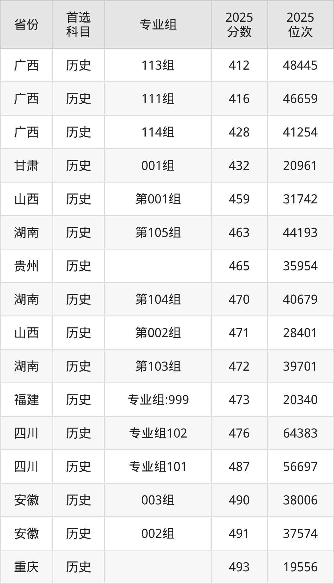 历史类最低分对应地区为广西(113组),录取位次为48445;最高分对应地区为广东(203组),录取位次为44199,超本科线54分。
