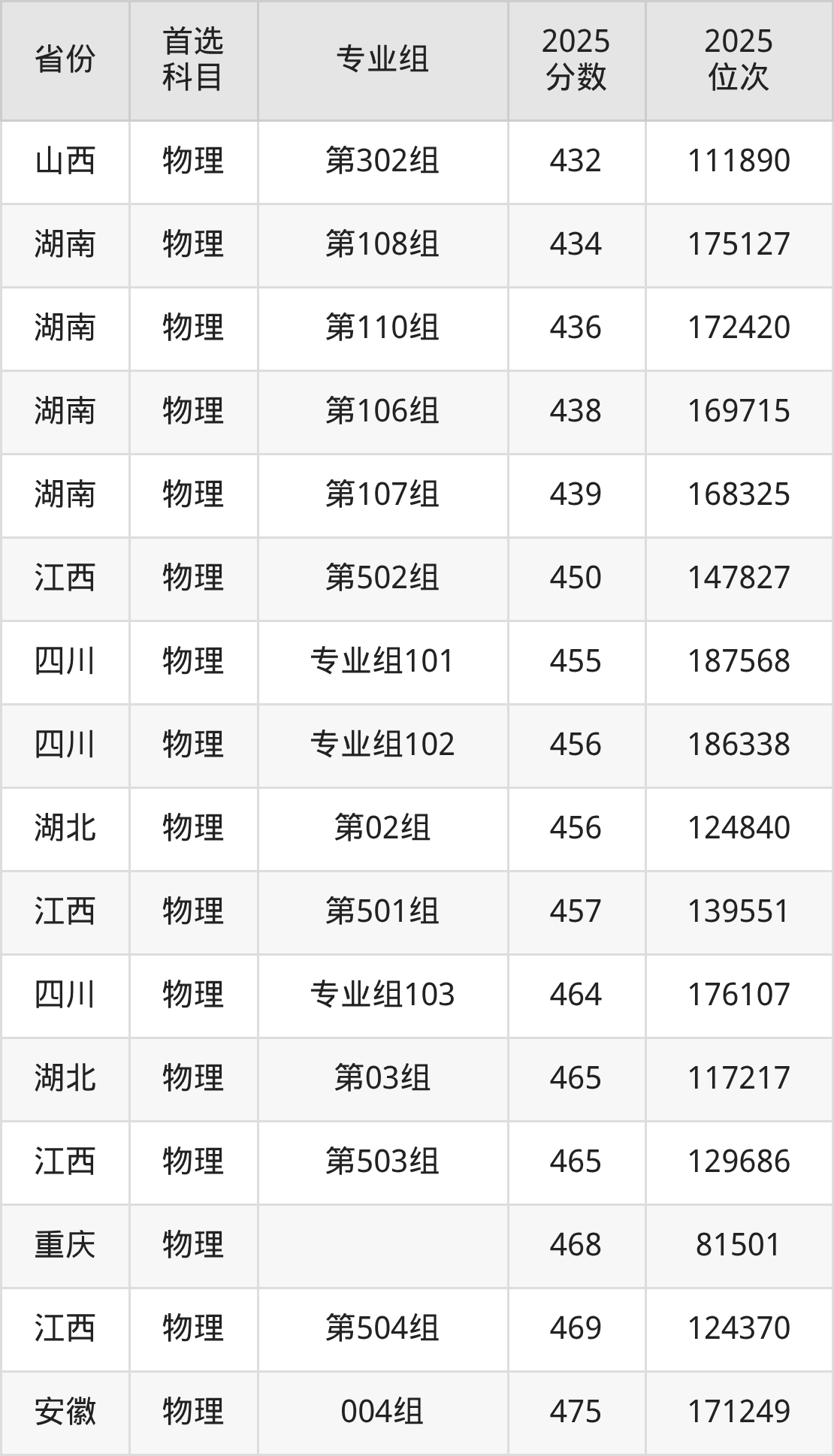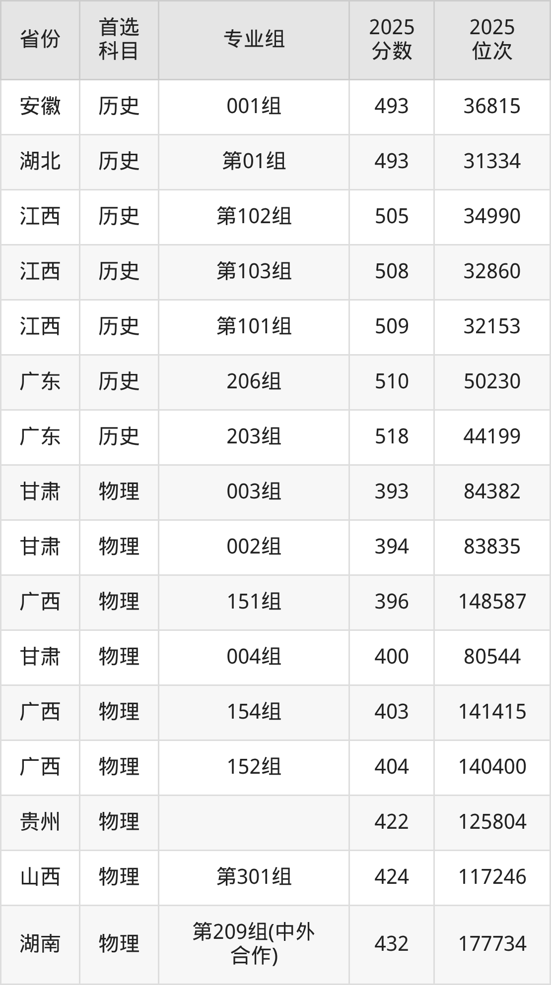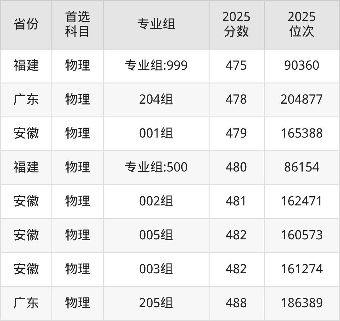 物理类最低分对应地区为甘肃(003组),录取位次为84382,超本科线19分;最高分对应地区为广东(205组),录取位次为186389,超本科线52分。