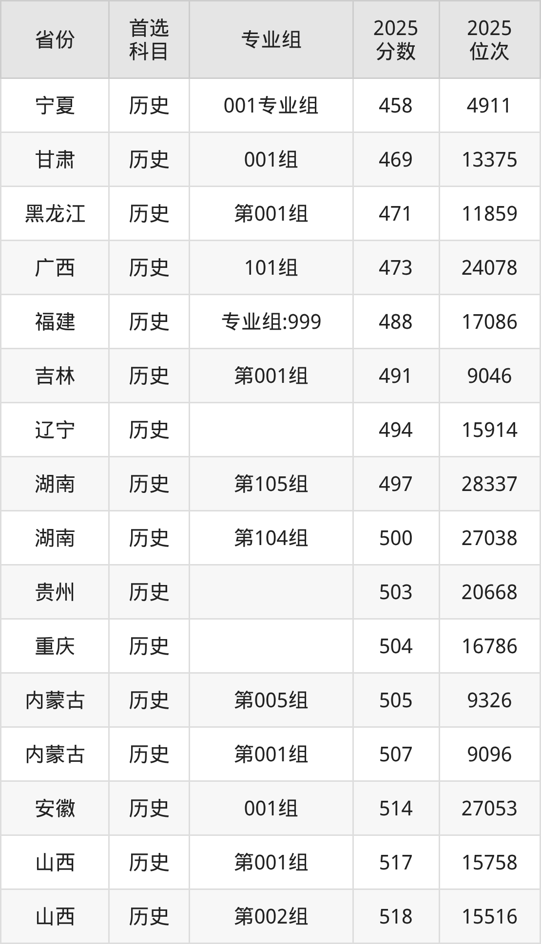 历史类最低分对应地区为宁夏(001专业组),录取位次为4911,超本科B54分;最高分对应地区为河北,录取位次为24485,超本科线69分。