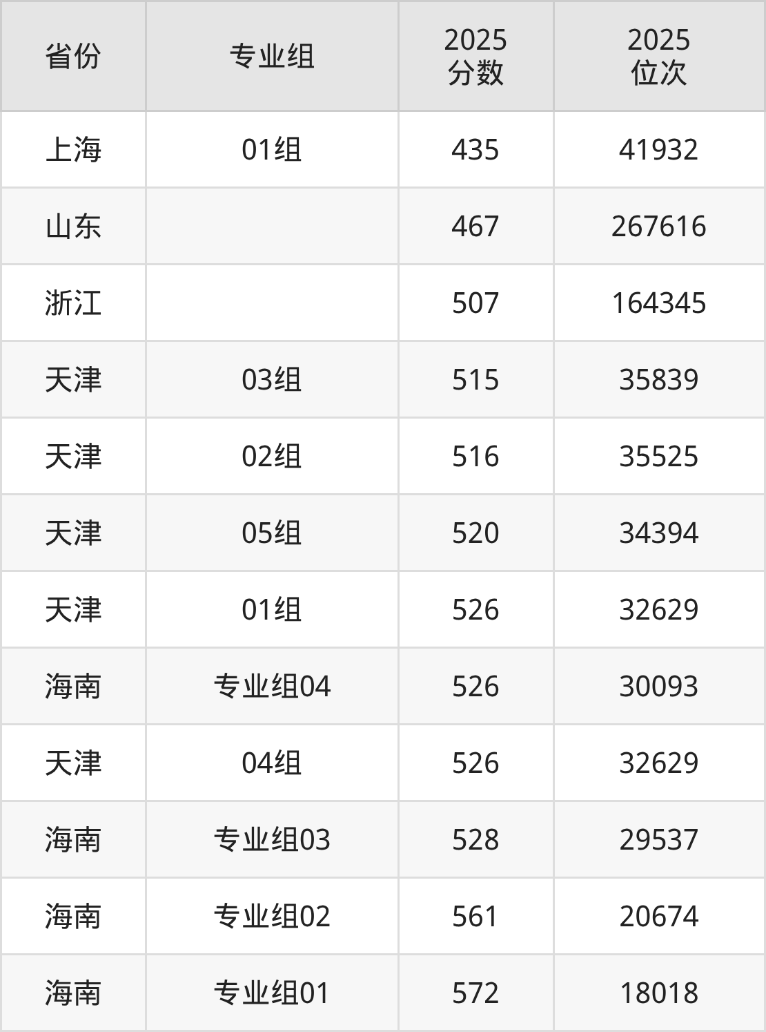 最低分对应地区为上海(01组),录取位次为41932,超本科线33分;最高分对应地区为海南(专业组01),录取位次为18018,超本科线92分。