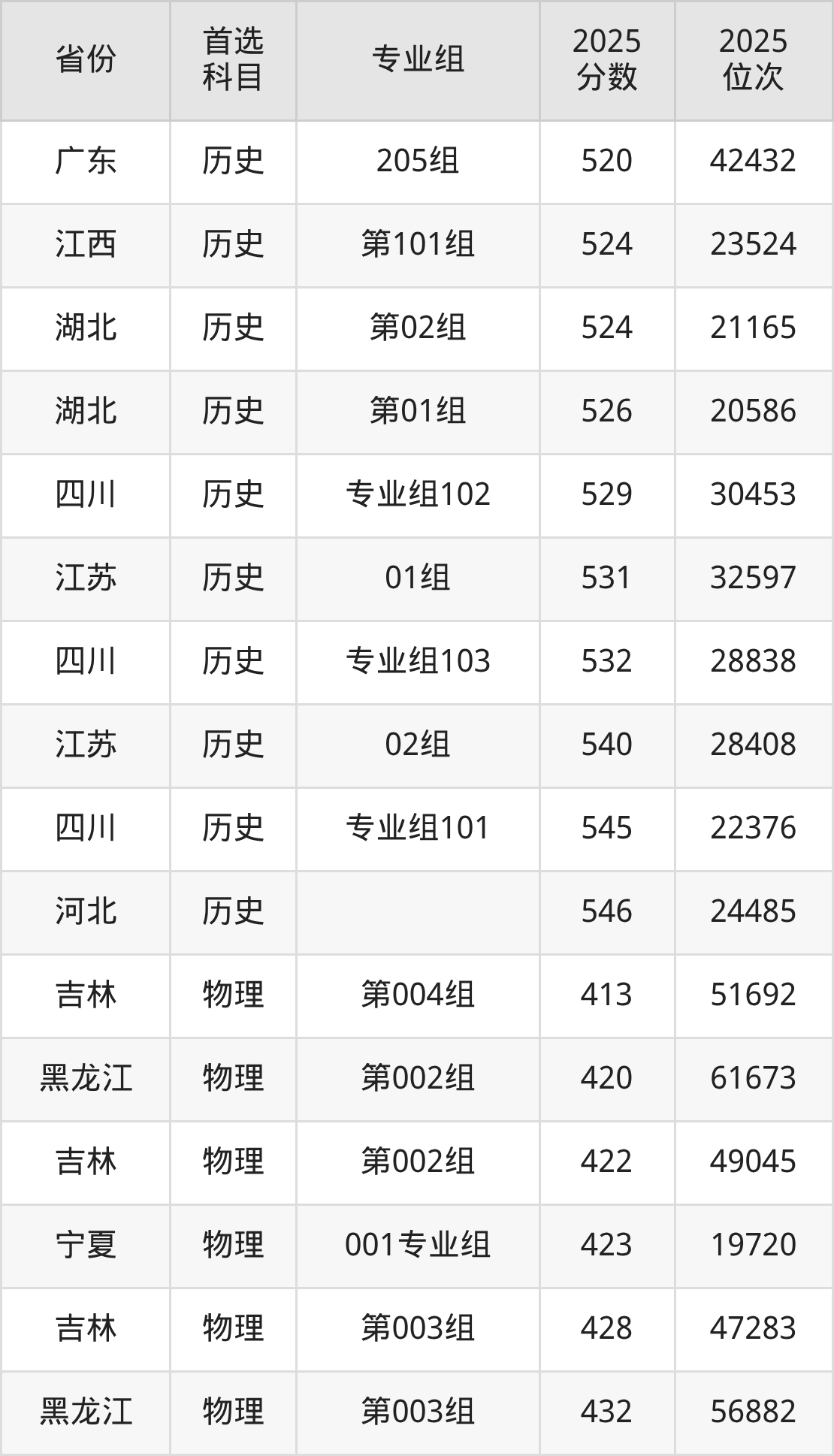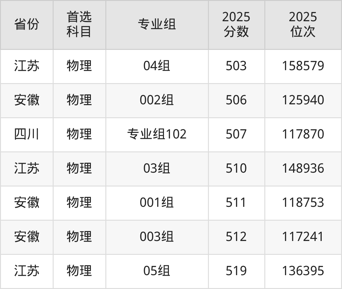物理类最低分对应地区为吉林(第004组),录取位次为51692,超本科线73分;最高分对应地区为江苏(05组),录取位次为136395,超本科线56分。