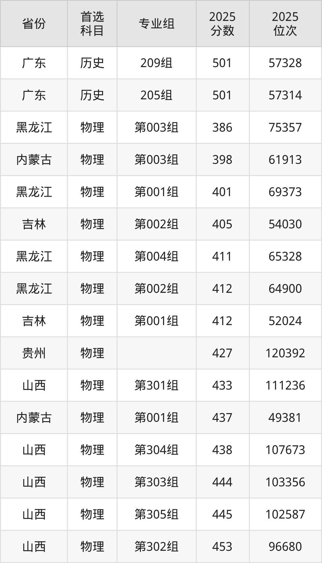 历史类最低分对应地区为广东(209组),录取位次为57328,超本科线37分;最高分对应地区为广东(205组),录取位次为57314,超本科线37分。