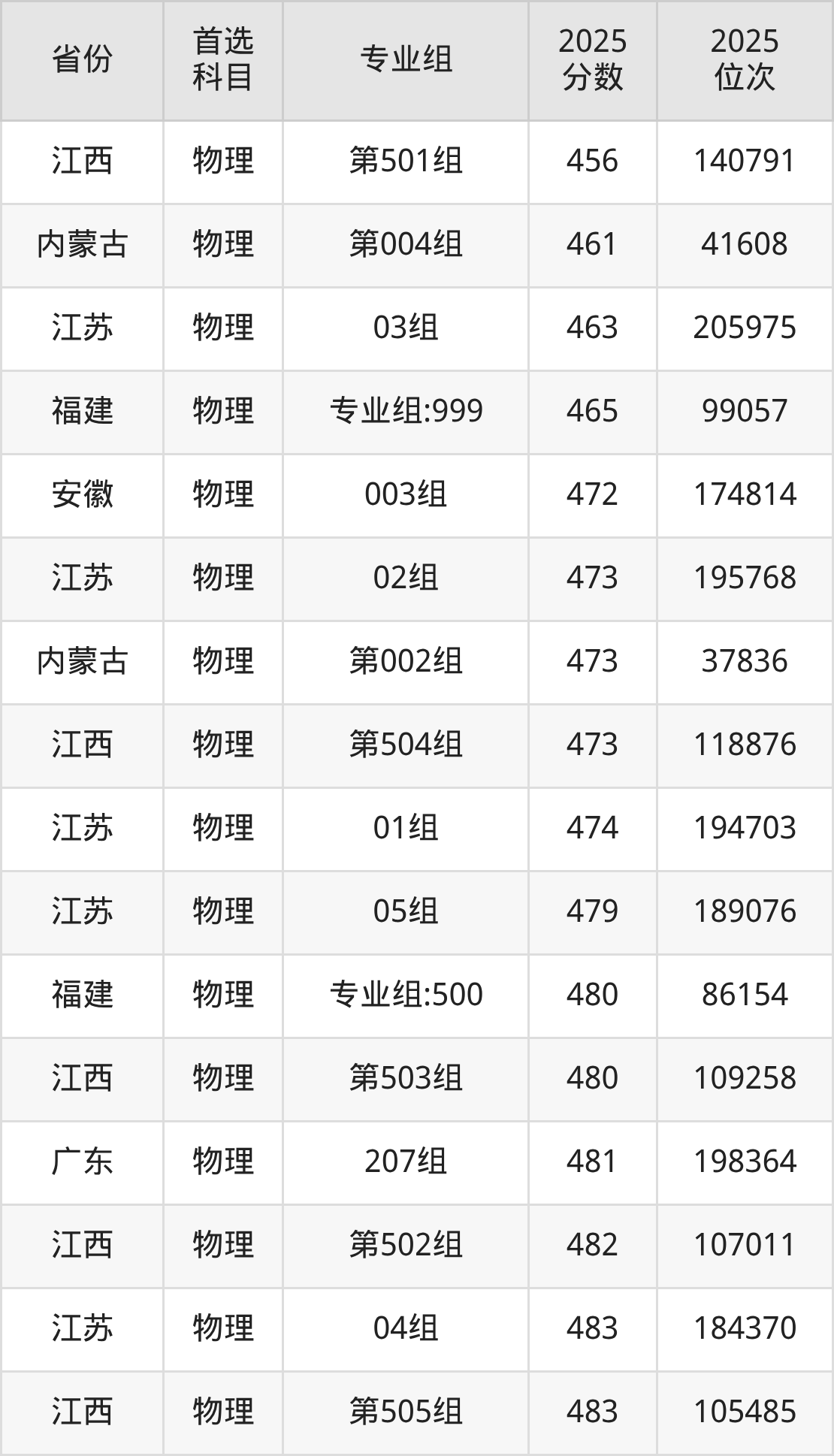 物理类最低分对应地区为黑龙江(第003组),录取位次为75357,超本科线26分;最高分对应地区为安徽(001组),录取位次为146784,超本科线31分。