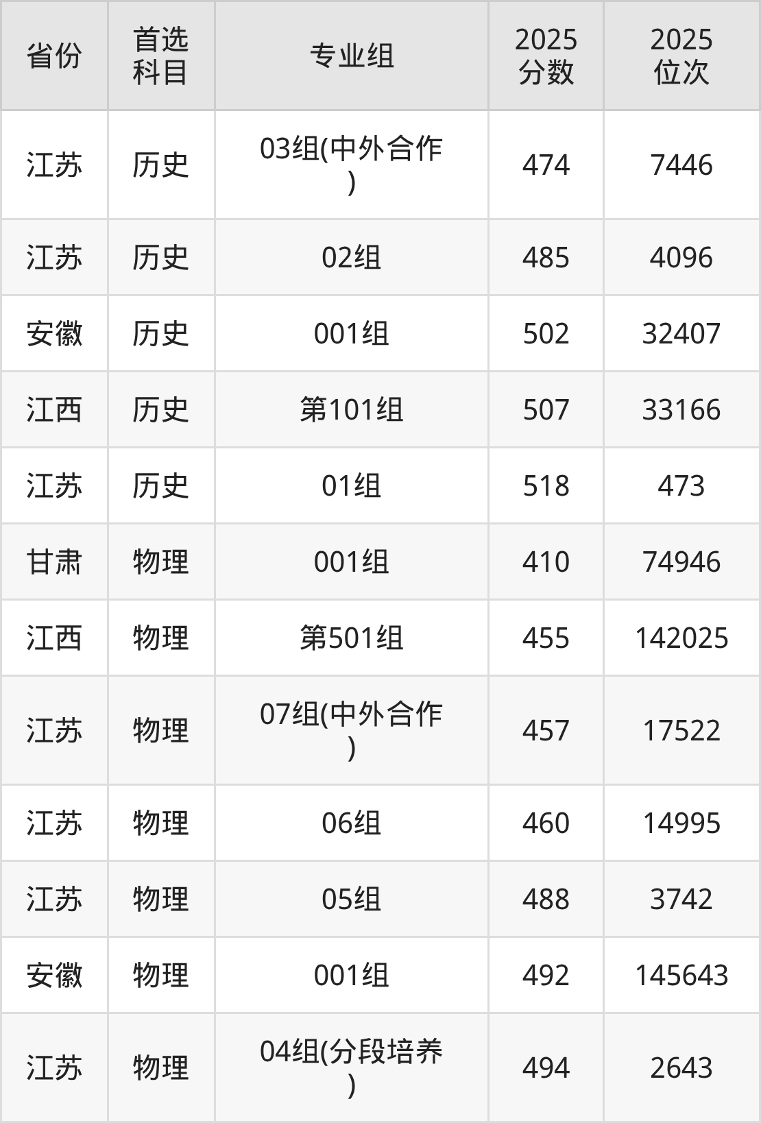 历史类最低分对应地区为江苏(03组(中外合作)),录取位次为7446,超专科线254分;最高分对应地区为江苏(01组),录取位次为473,超专科线298分。