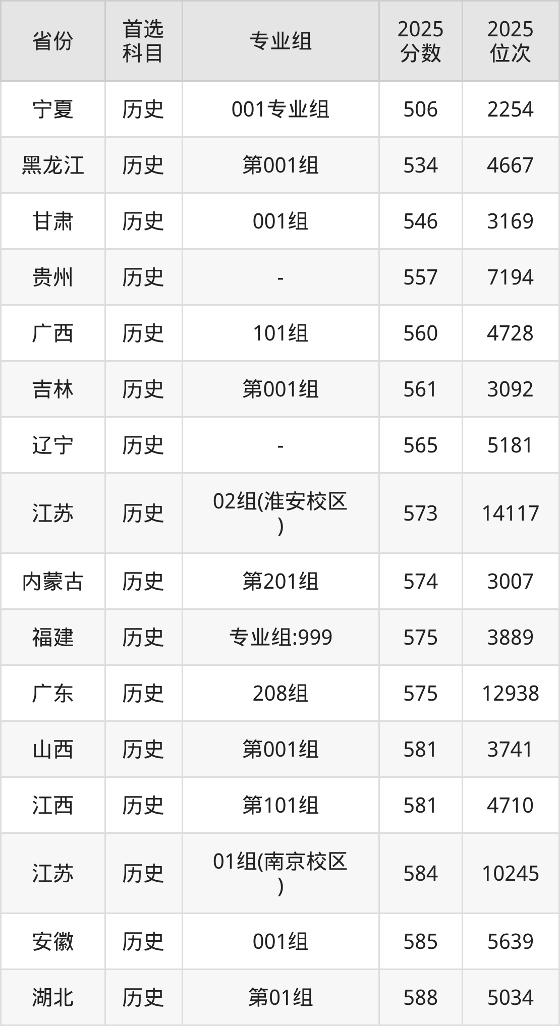 历史类:01组(南京校区)584分、10245名,02组(淮安校区)573分、14117名;