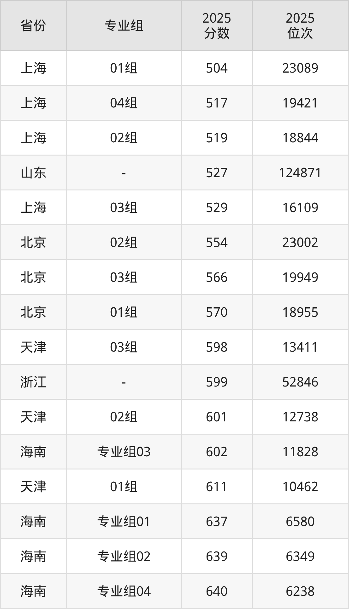 最低分对应地区为上海(01组),录取位次为23089,超本科线102分;最高分对应地区为海南(专业组04),录取位次为6238。