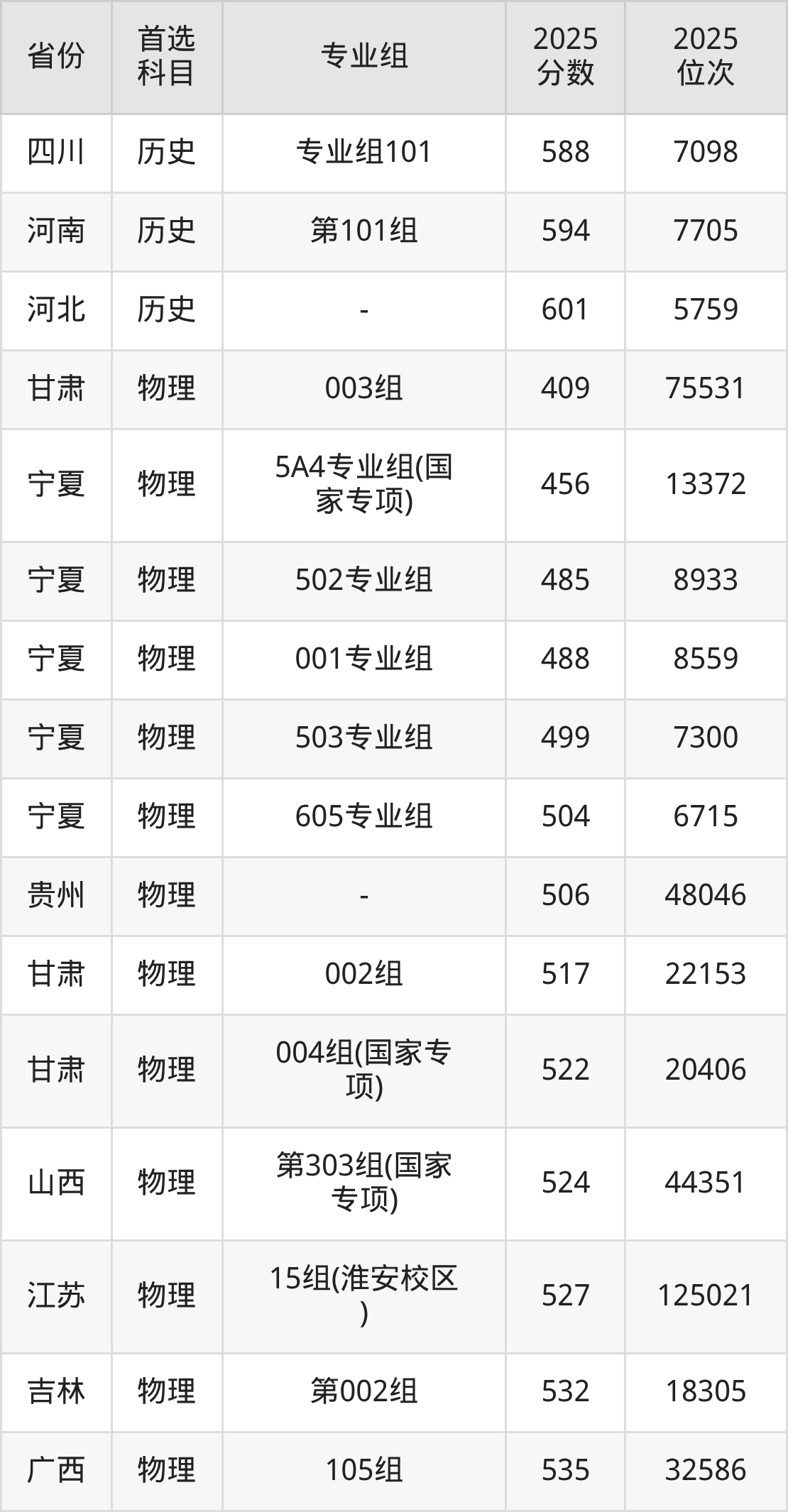 历史类最低分对应地区为宁夏(001专业组),录取位次为2254,超本科B102分;最高分对应地区为河北,录取位次为5759,超本科线124分。