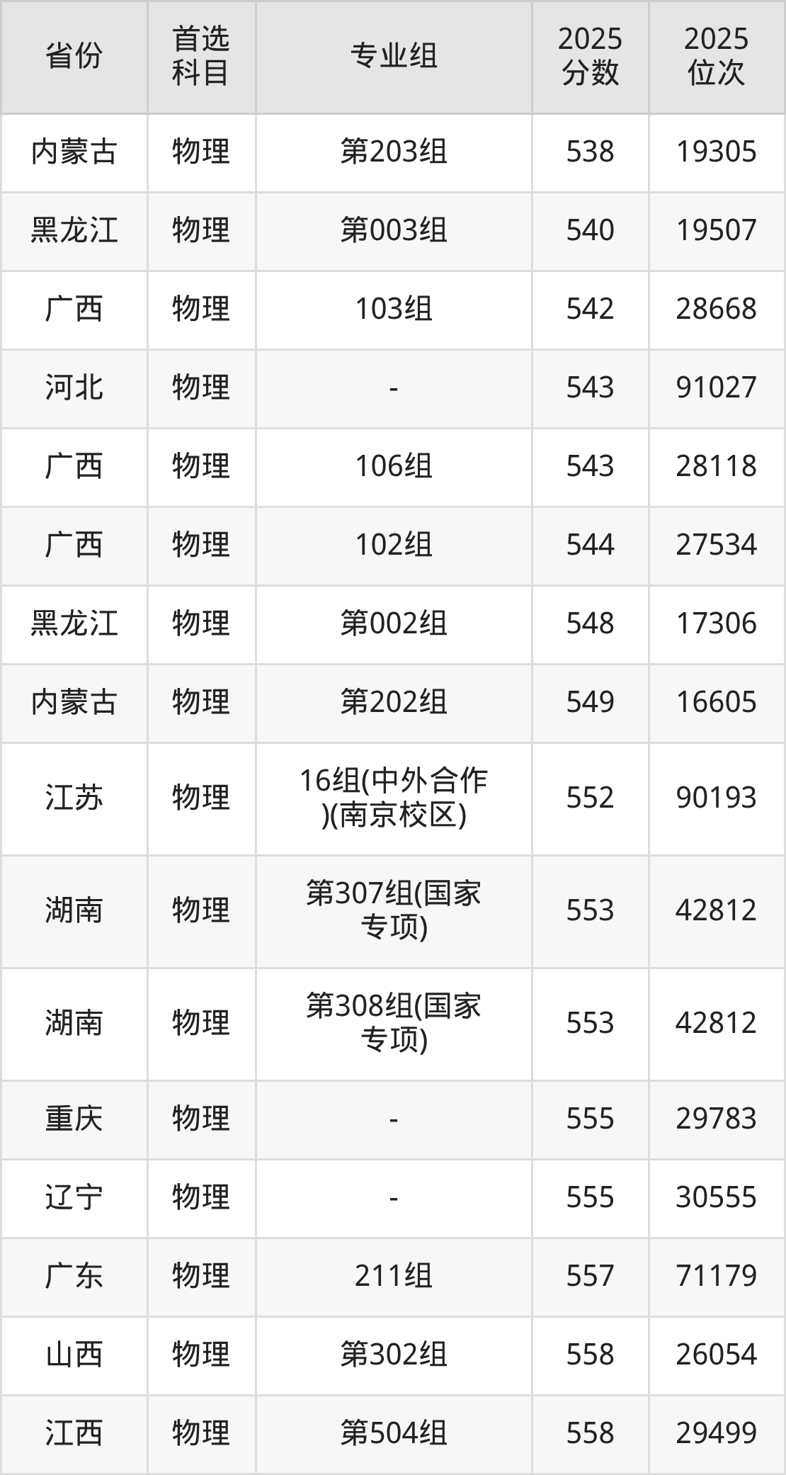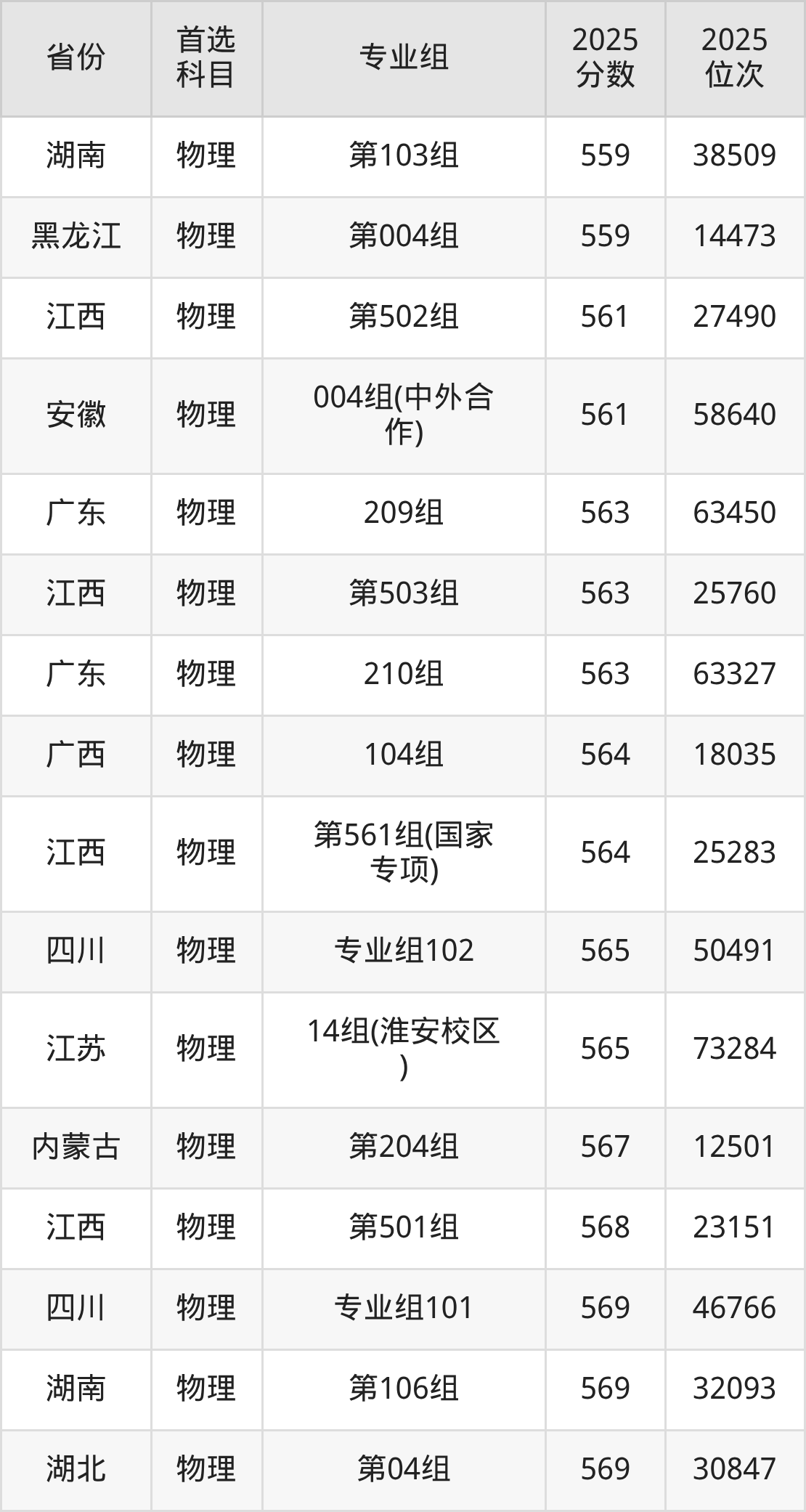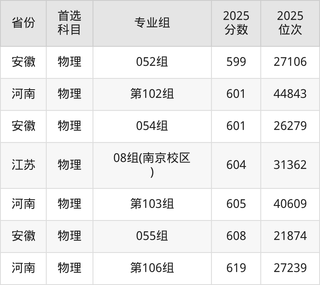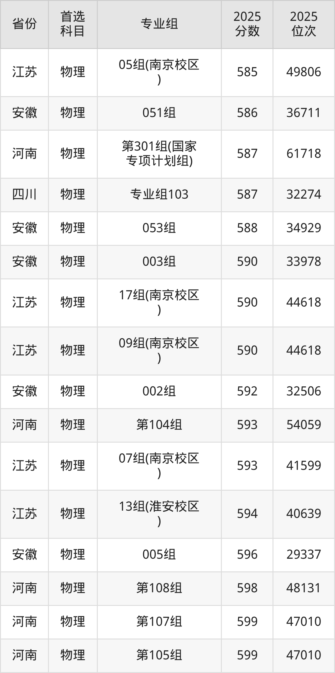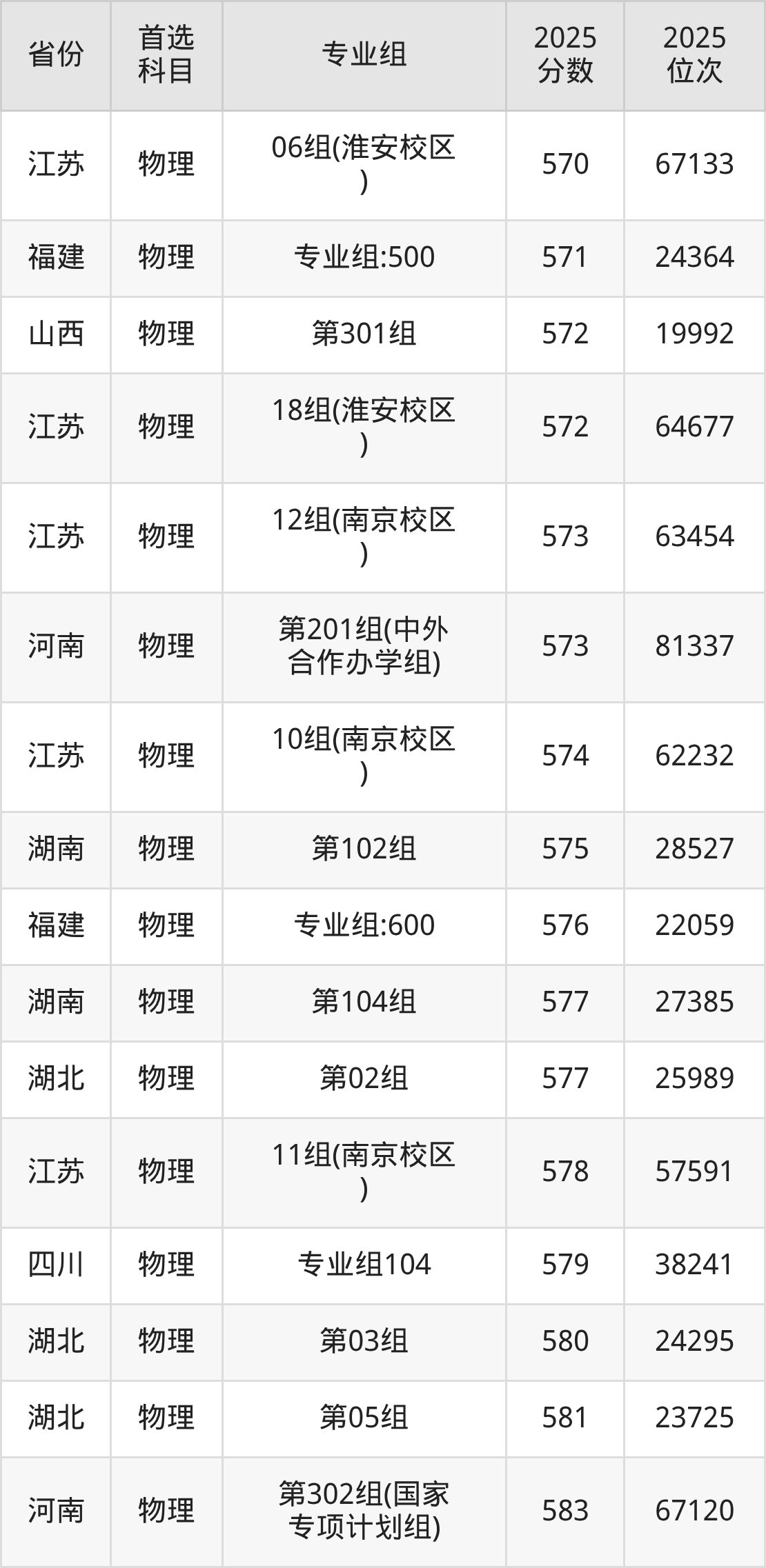 物理类:05组(南京校区)585分、49806名,06组(淮安校区)570分、67133名,07组(南京校区)593分、41599名,08组(南京校区)604分、31362名,09组(南京校区)590分、44618名,10组(南京校区)574分、62232名,11组(南京校区)578分、57591名,12组(南京校区)573分、63454名,13组(淮安校区)594分、40639名,14组(淮安校区)565分、73284名,15组(淮安校区)527分、125021名,16组(中外合作)(南京校区)552分、90193名,17组(南京校区)590分、44618名,18组(淮安校区)572分、64677名;