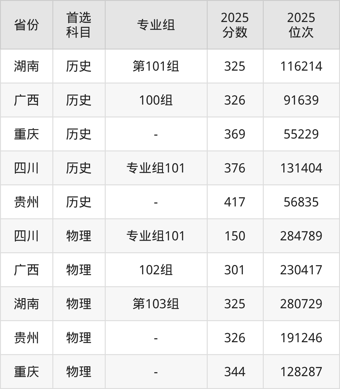物理类最低分对应地区为四川(专业组101),录取位次为284789;最高分对应地区为重庆,录取位次为128287,超专科线164分。