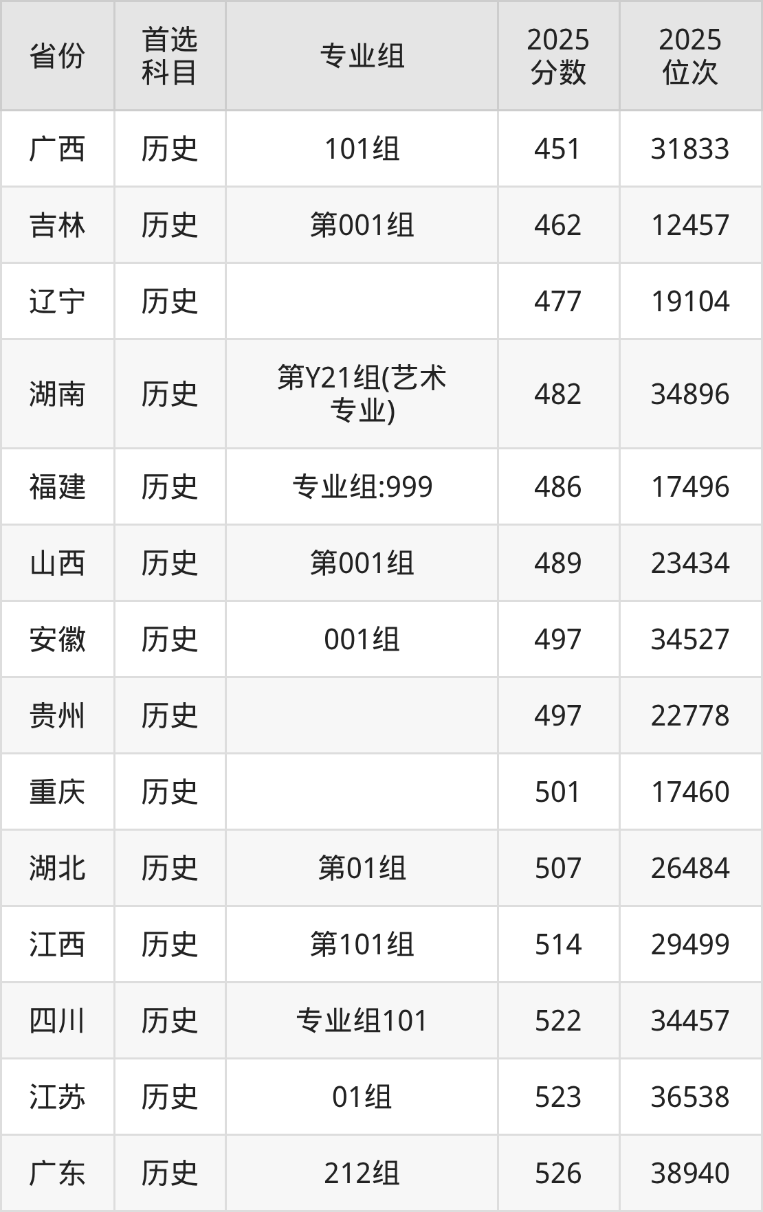 历史类最低分对应地区为广西(101组),录取位次为31833,超本科线49分;最高分对应地区为广东(212组),录取位次为38940,超本科线62分。