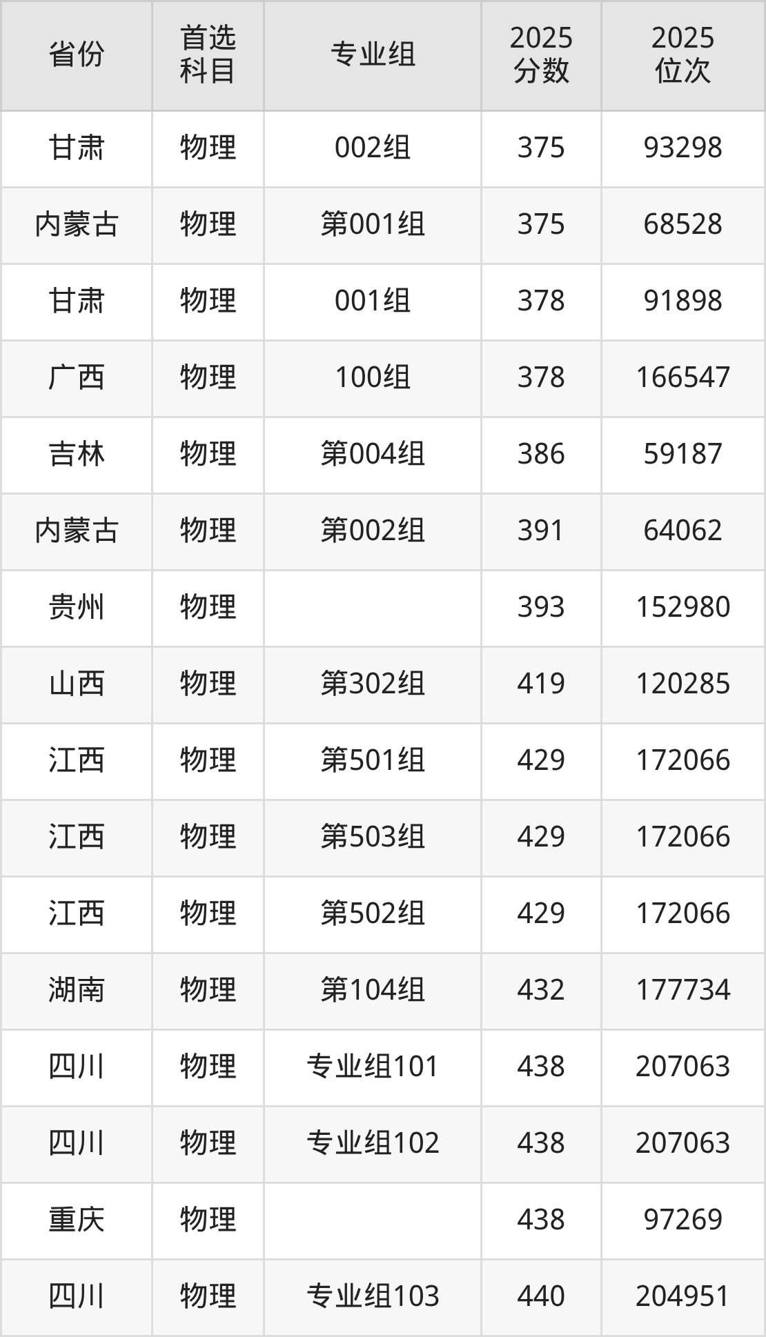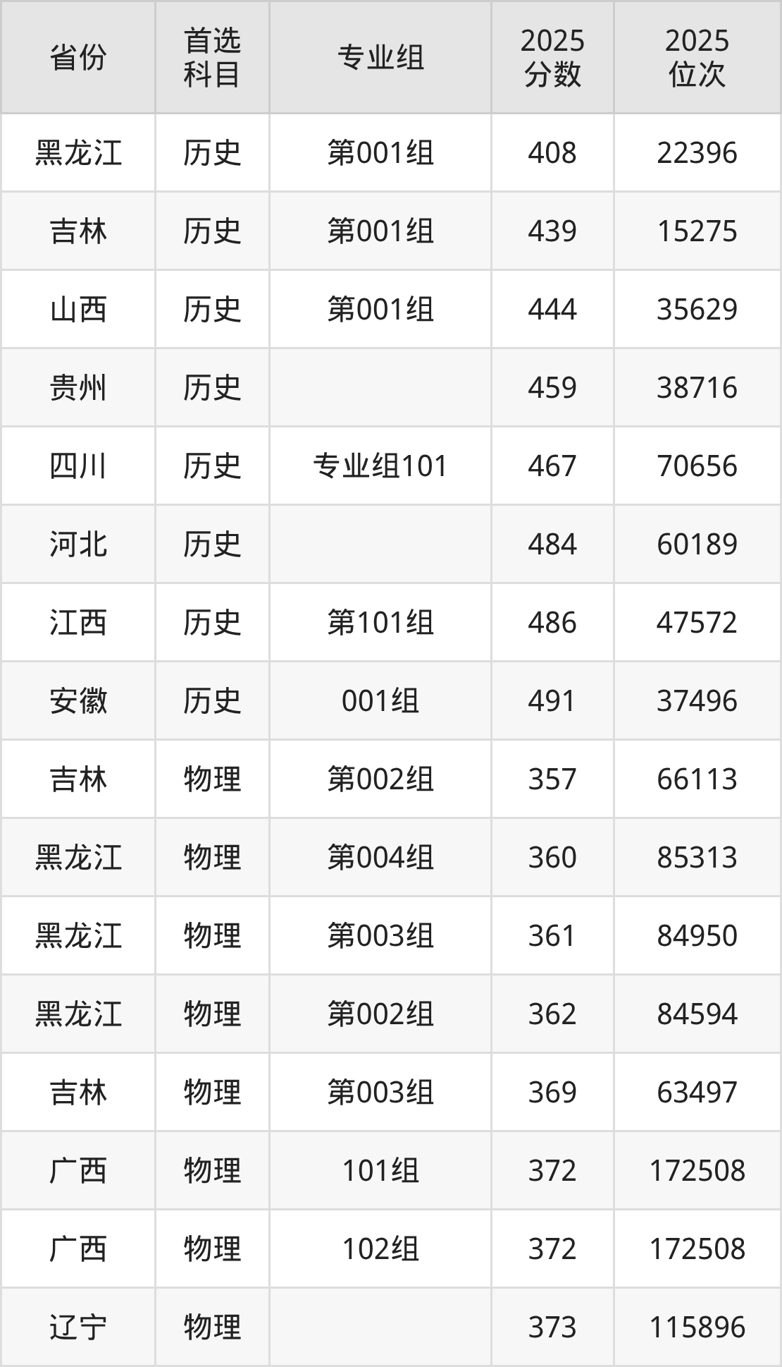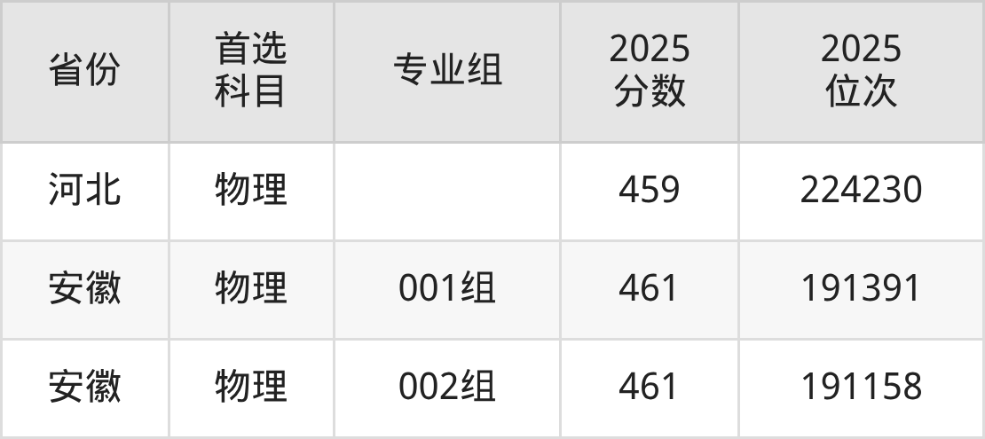 物理类最低分对应地区为吉林(第002组),录取位次为66113,超本科线17分;最高分对应地区为安徽(002组),录取位次为191158。