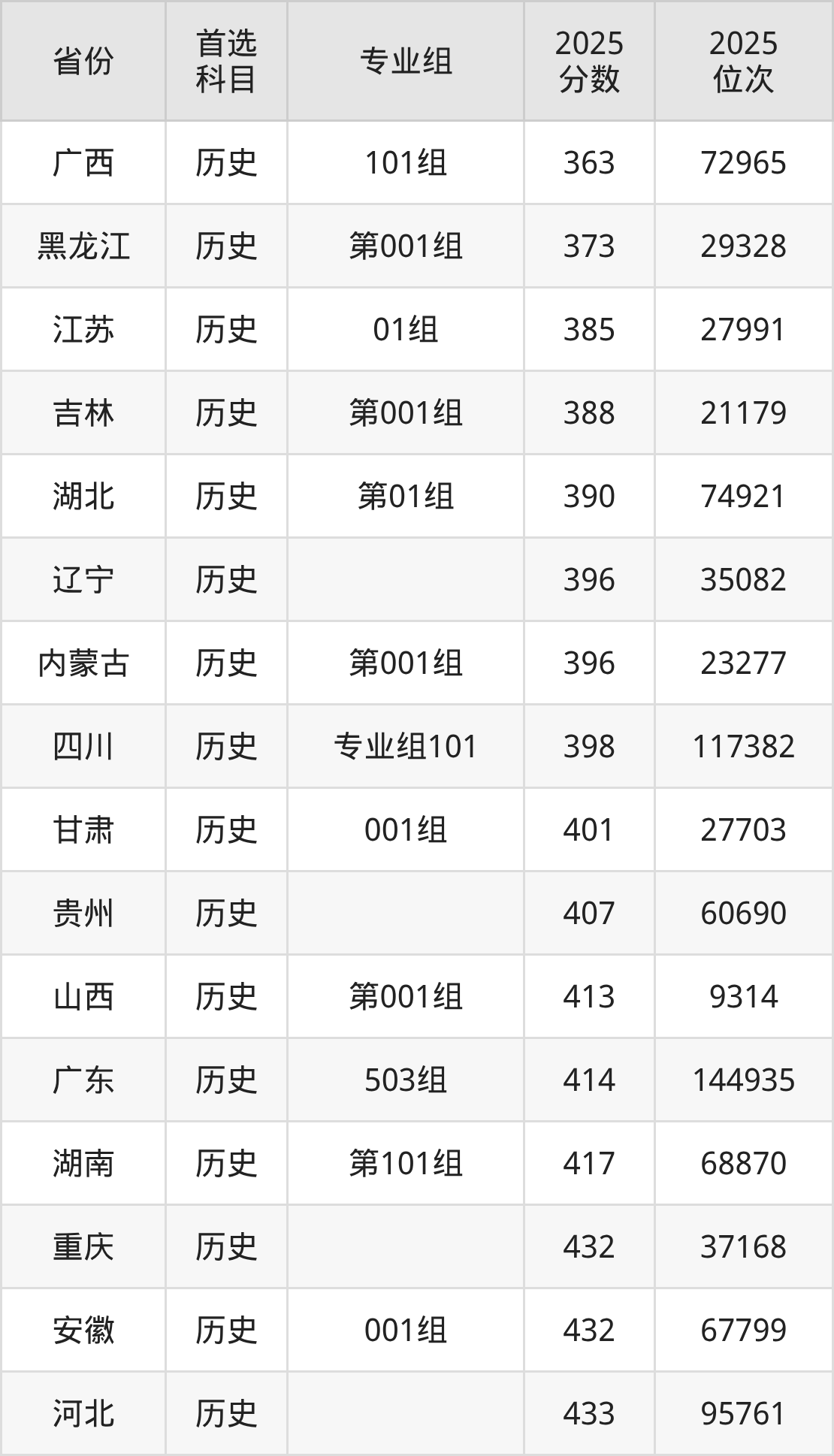 历史类最低分对应地区为广西(101组),录取位次为72965,超专科线163分;最高分对应地区为江西(第101组),录取位次为54742,超专科线185分。