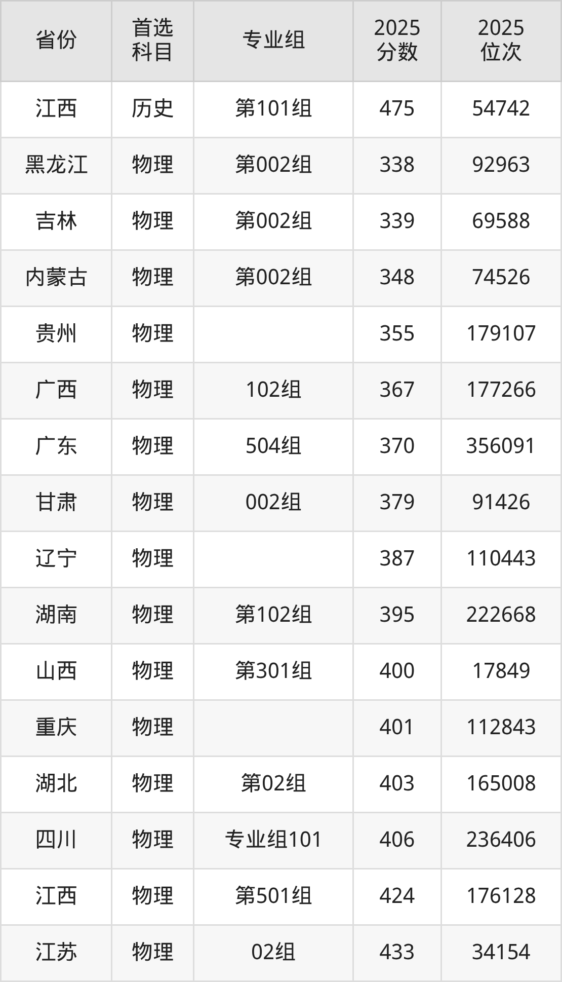物理类最低分对应地区为黑龙江(第002组),录取位次为92963,超专科线178分;最高分对应地区为安徽(001组),录取位次为199553,超专科线254分。