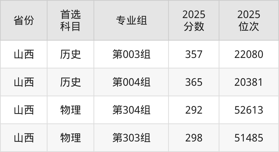 历史类最低分对应地区为山西(第003组),录取位次为22080,超专科线257分;最高分对应地区为山西(第004组),录取位次为20381,超专科线265分。