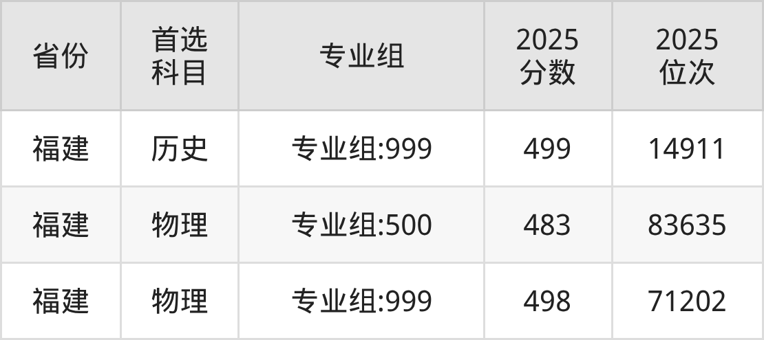 物理类最低分对应地区为福建(专业组:500),录取位次为83635,超本科线42分;最高分对应地区为福建(专业组:999),录取位次为71202,超本科线57分。