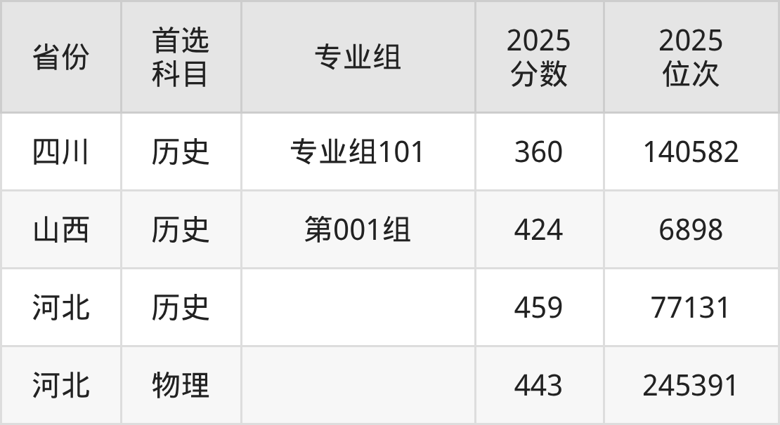 历史类最低分对应地区为四川(专业组101),录取位次为140582;最高分对应地区为河北,录取位次为77131,超专科线259分。