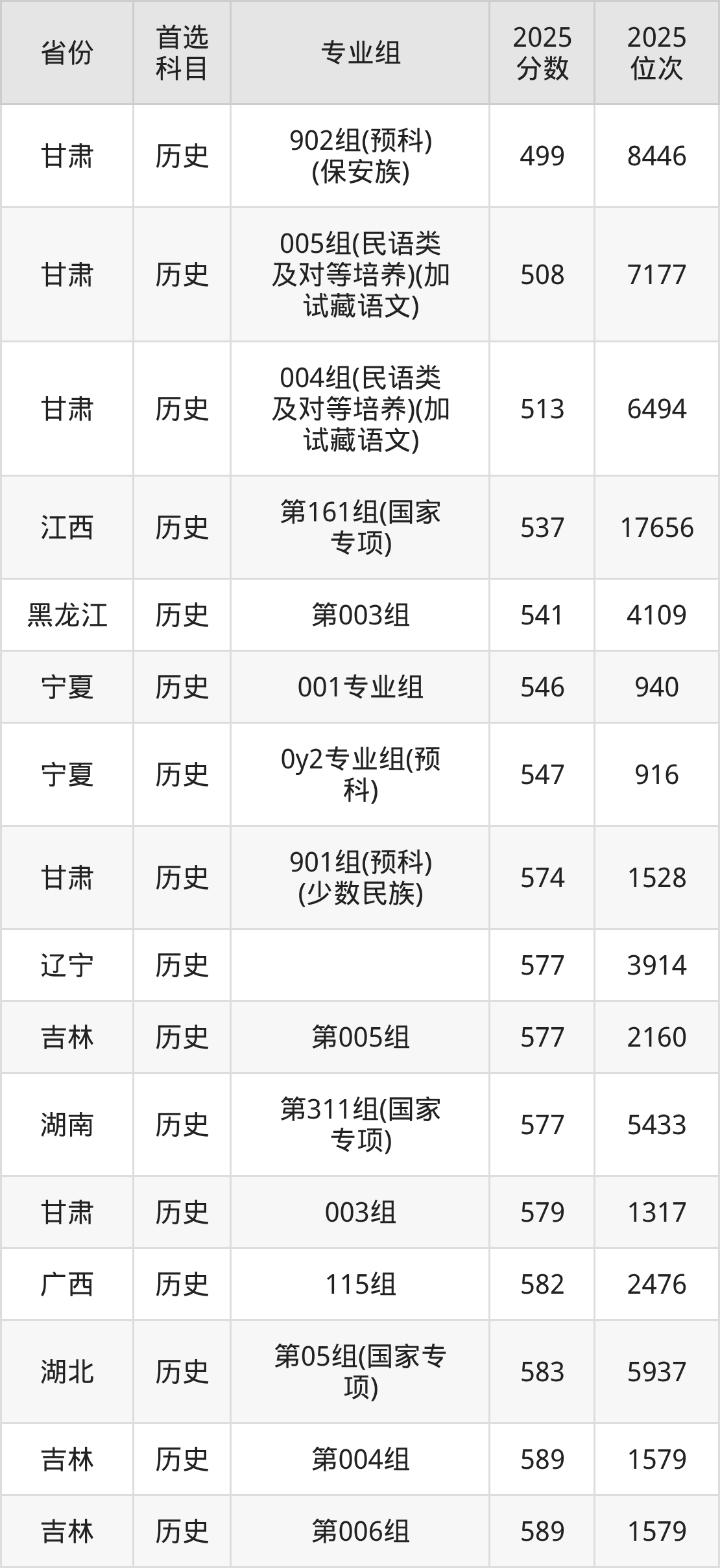 历史类最低分对应地区为甘肃(902组(预科)(保安族)),录取位次为8446,超本科线87分;最高分对应地区为河北,录取位次为2071,超本科线147分。