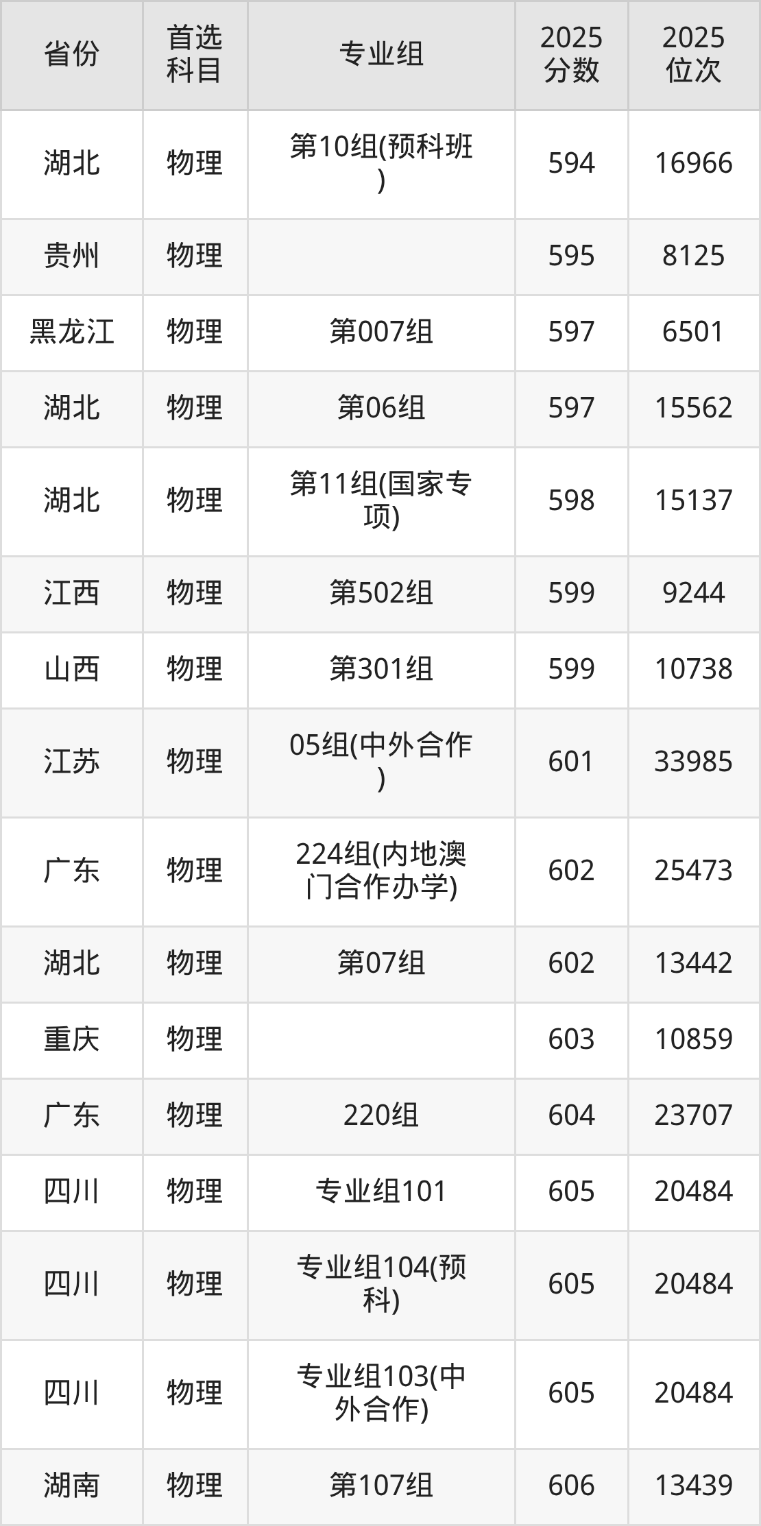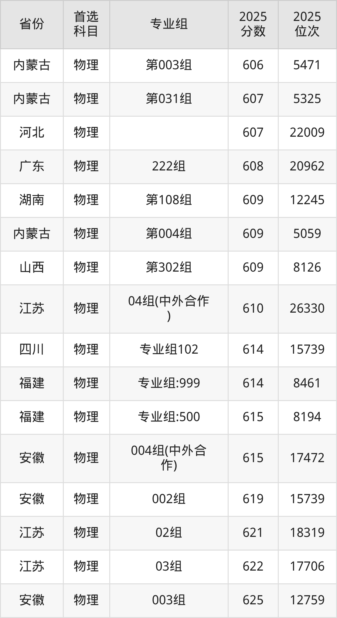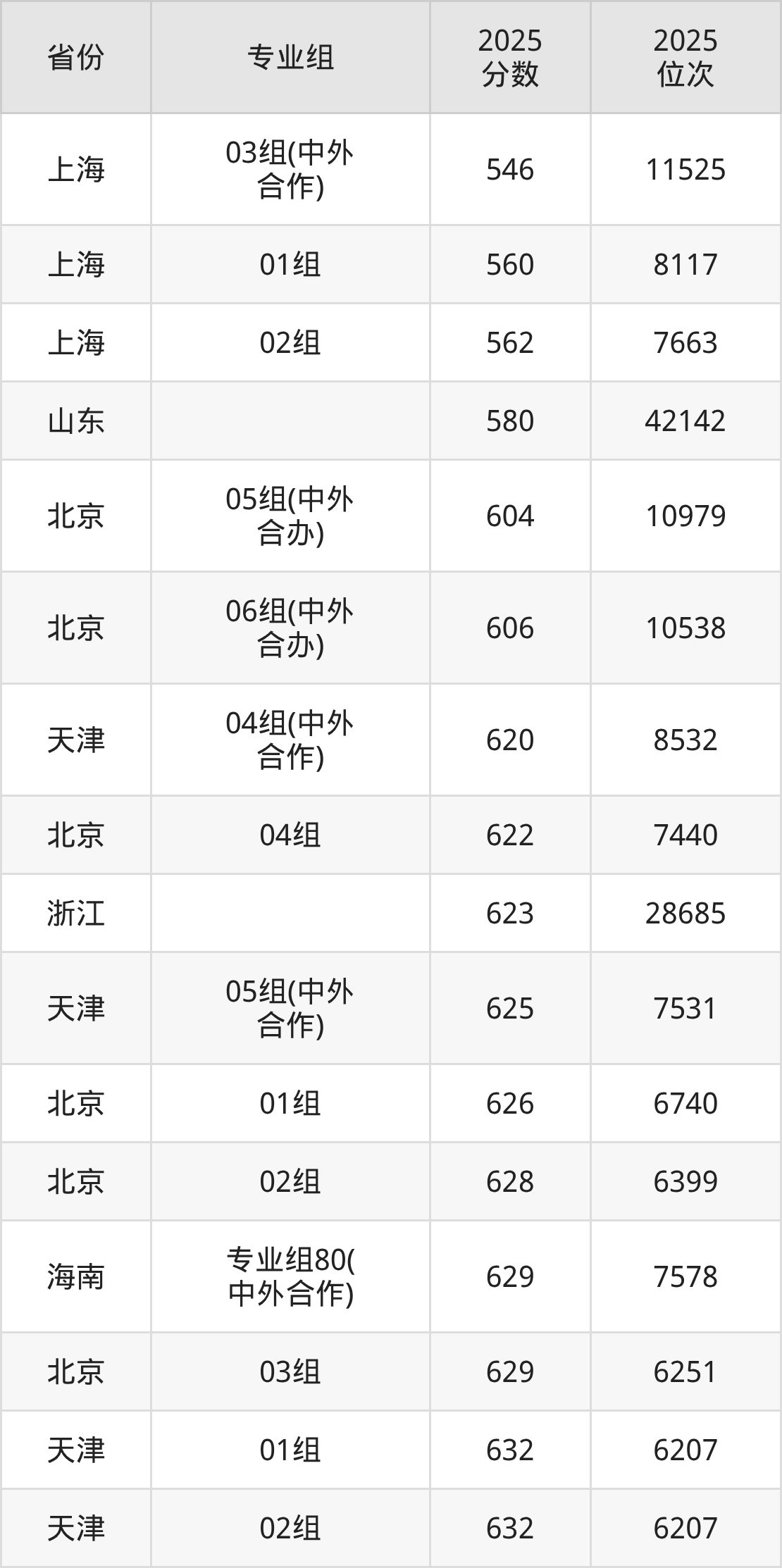 01组626分、6740名,02组628分、6399名,03组629分、6251名,04组622分、7440名,05组(中外合办)604分、10979名,06组(中外合办)606分、10538名;