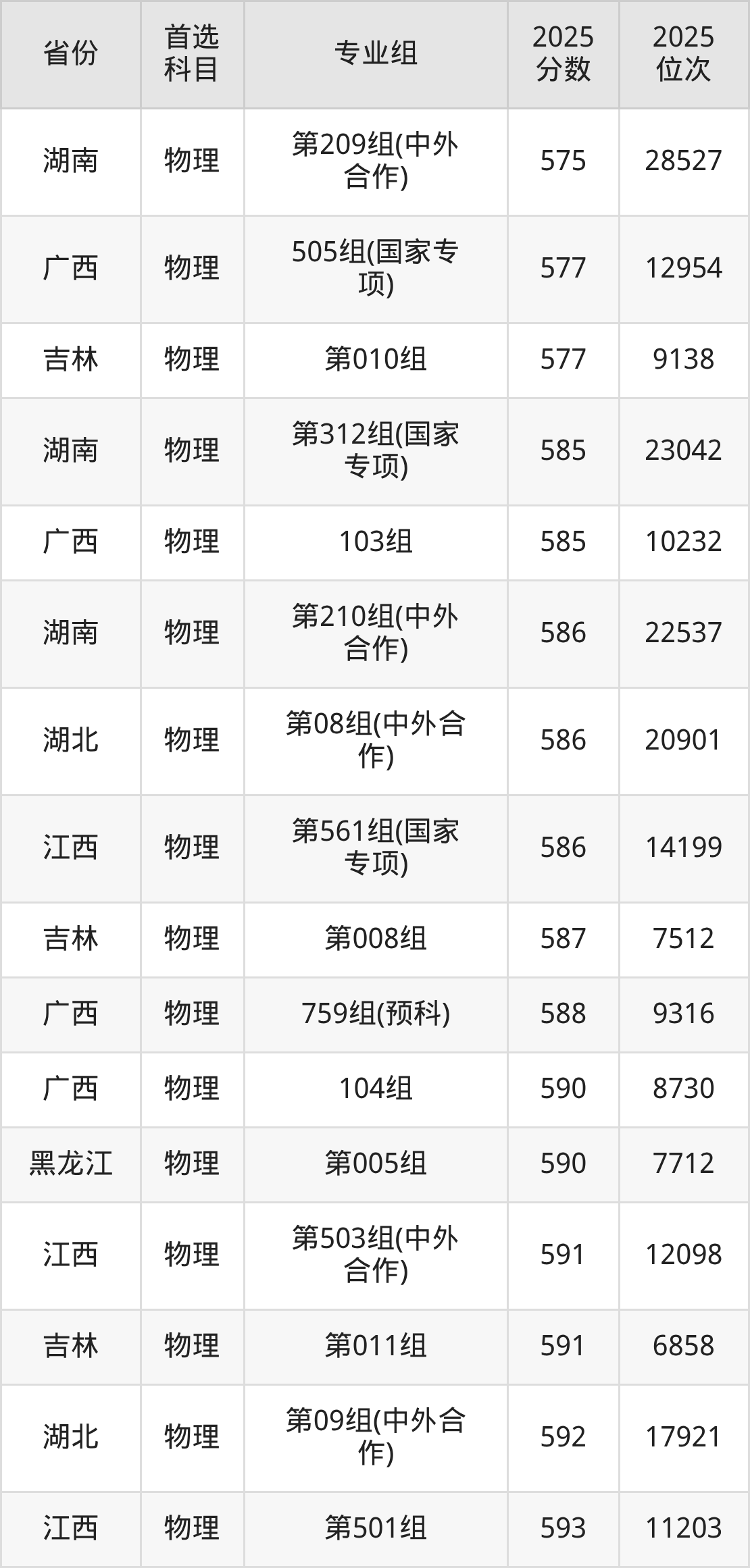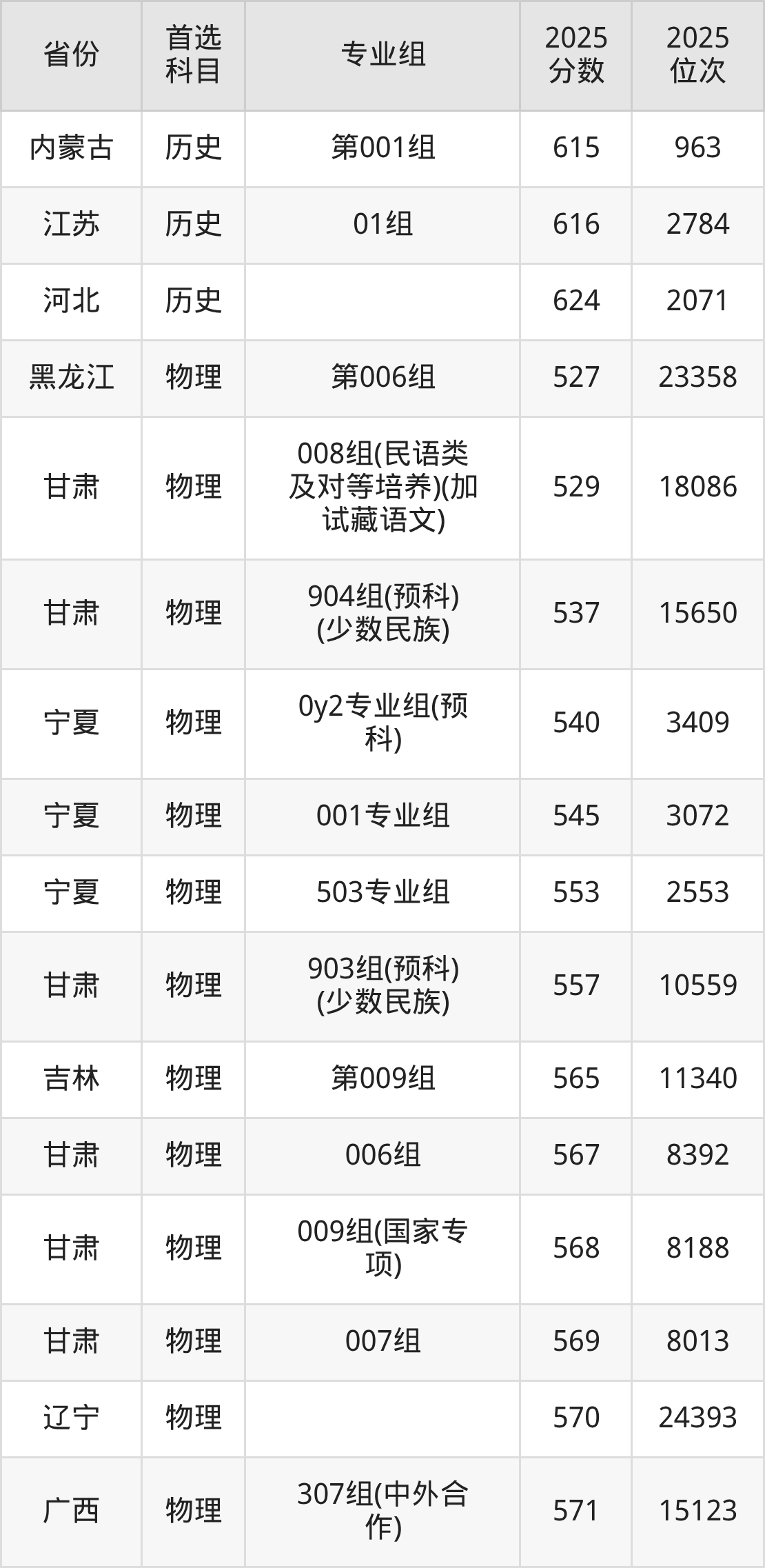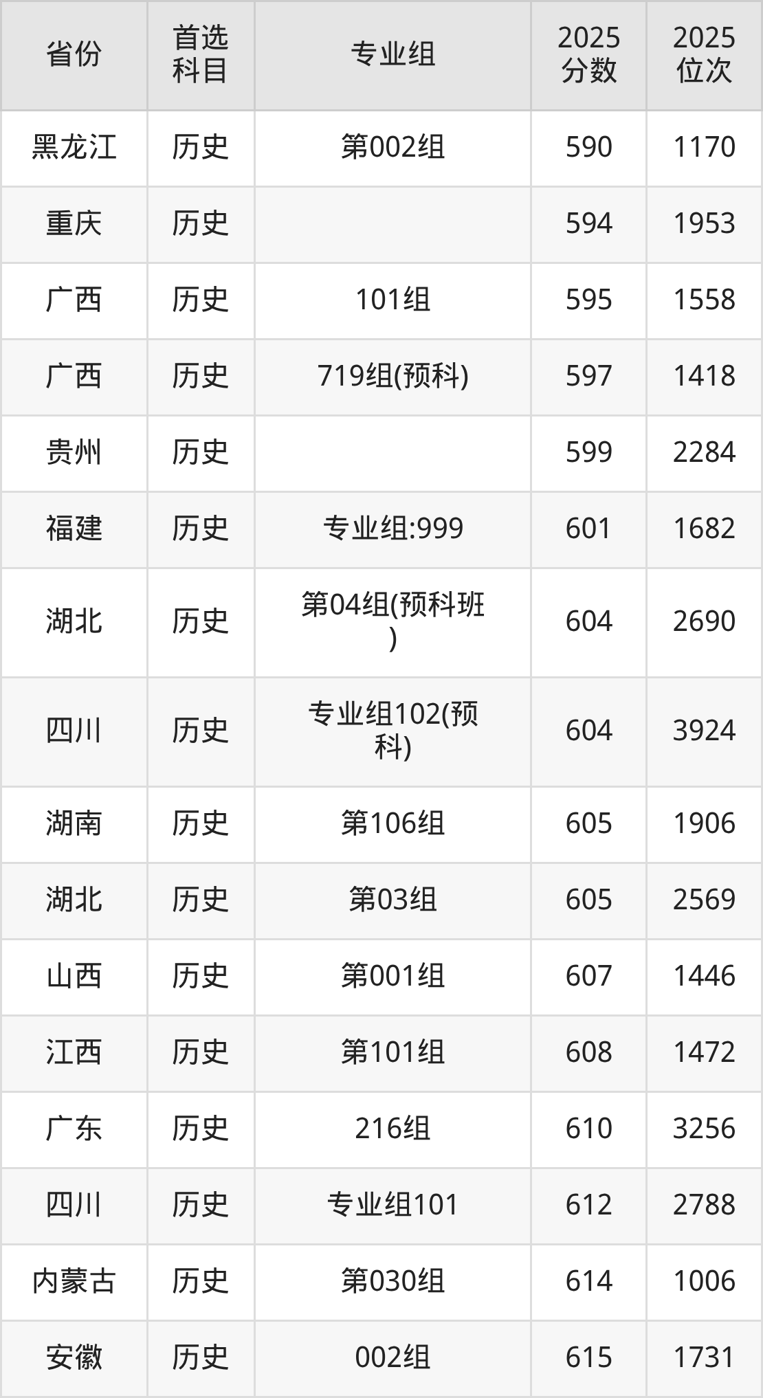 01组626分、6740名,02组628分、6399名,03组629分、6251名,04组622分、7440名,05组(中外合办)604分、10979名,06组(中外合办)606分、10538名;