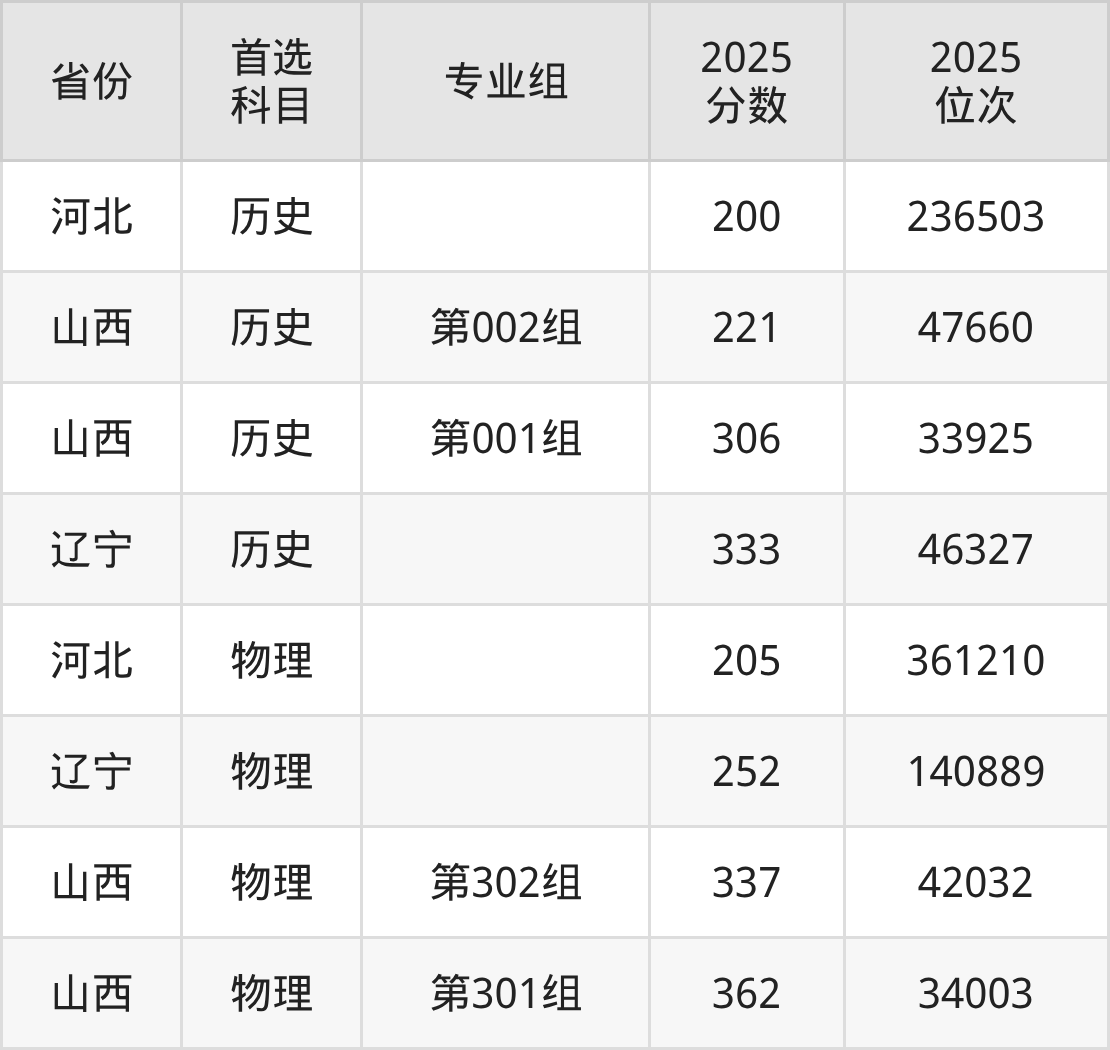 物理类最低分对应地区为河北,录取位次为361210,超专科线5分;最高分对应地区为山西(第301组),录取位次为34003,超专科线262分。