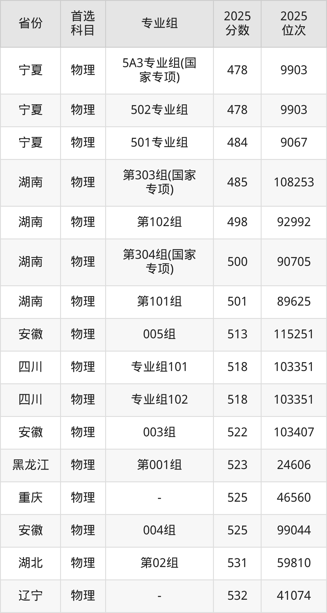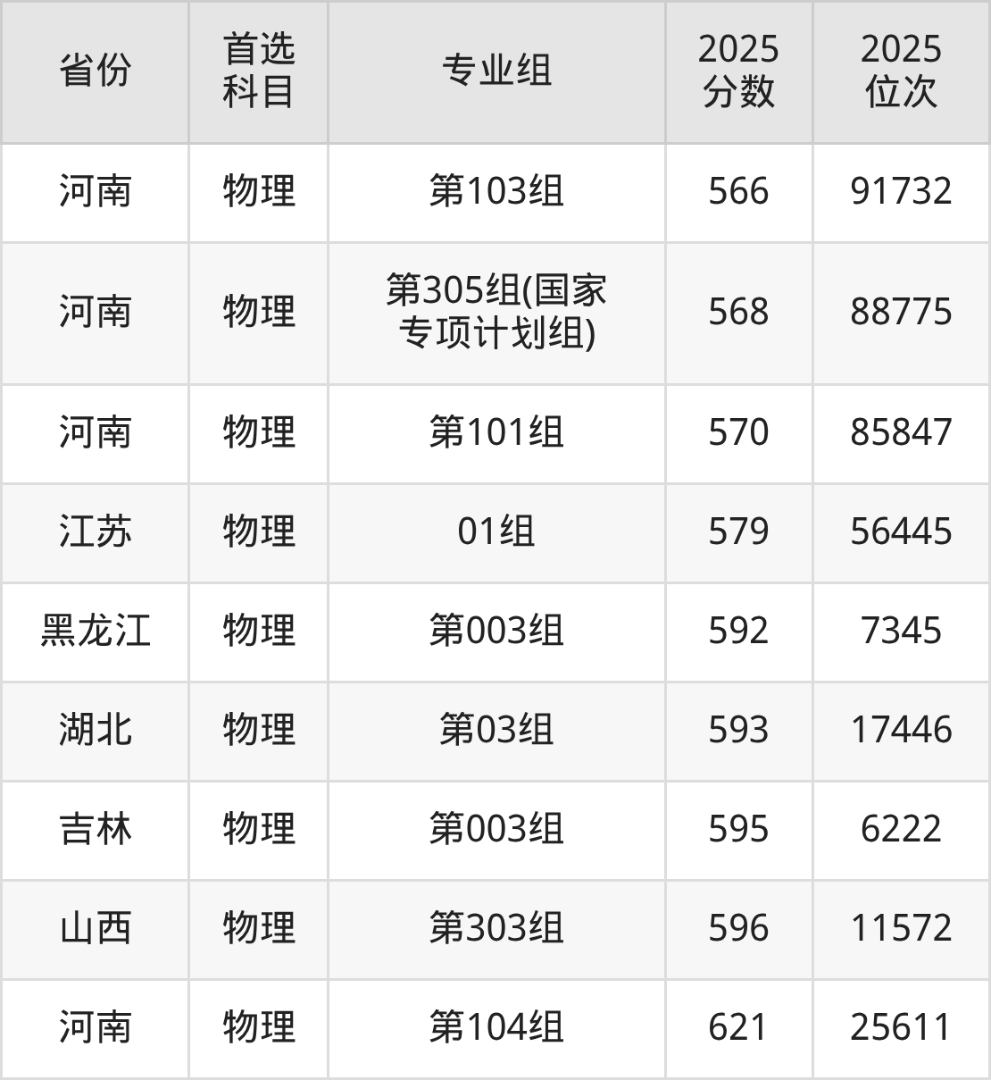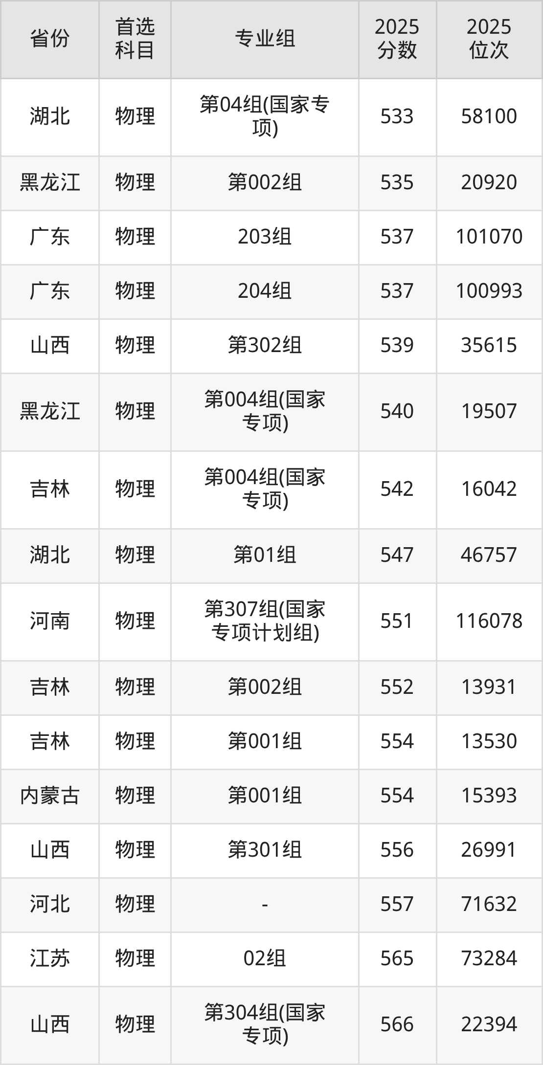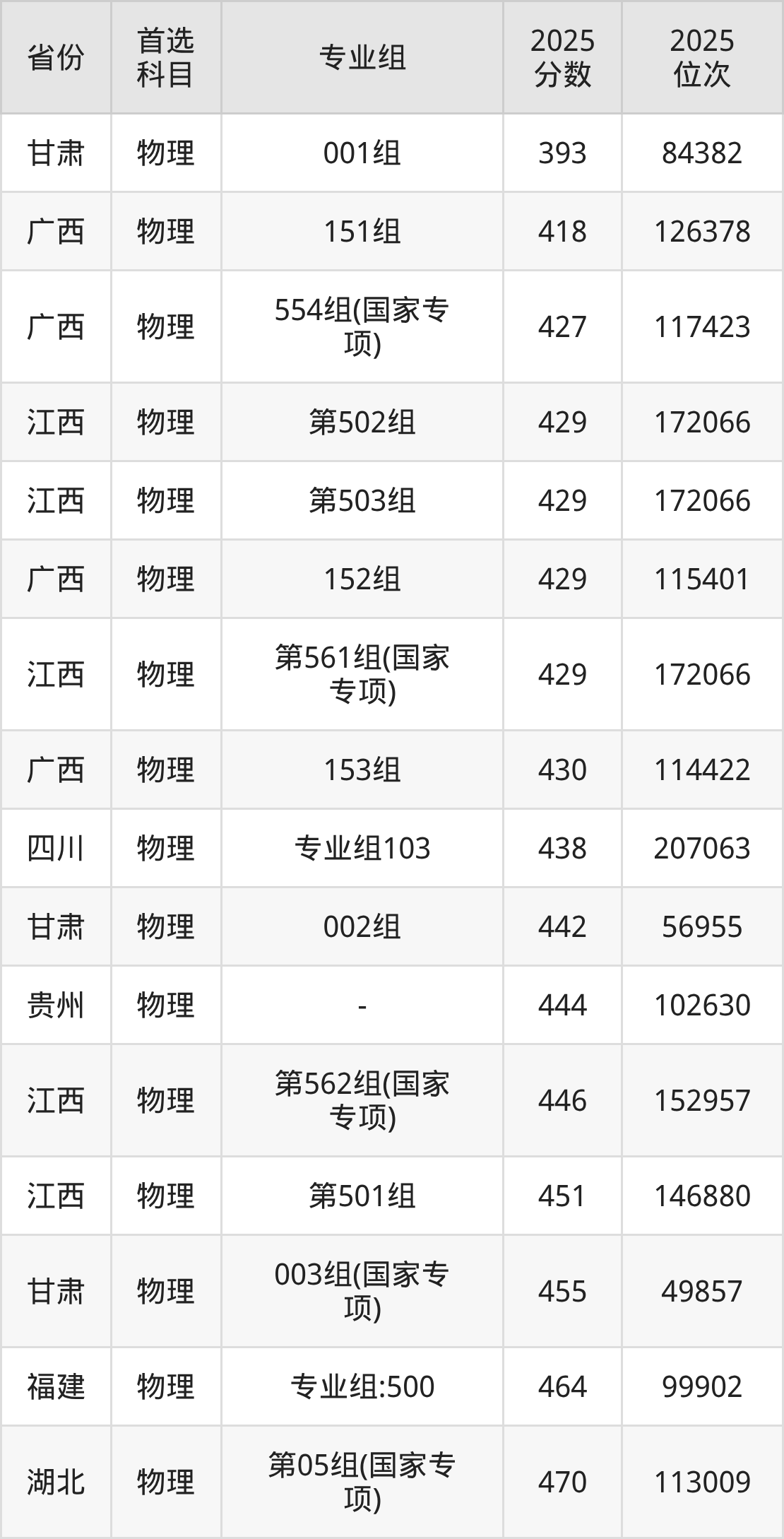 物理类最低分对应地区为甘肃(001组),录取位次为84382,超本科线19分;最高分对应地区为河南(第104组),录取位次为25611,超本科线194分。