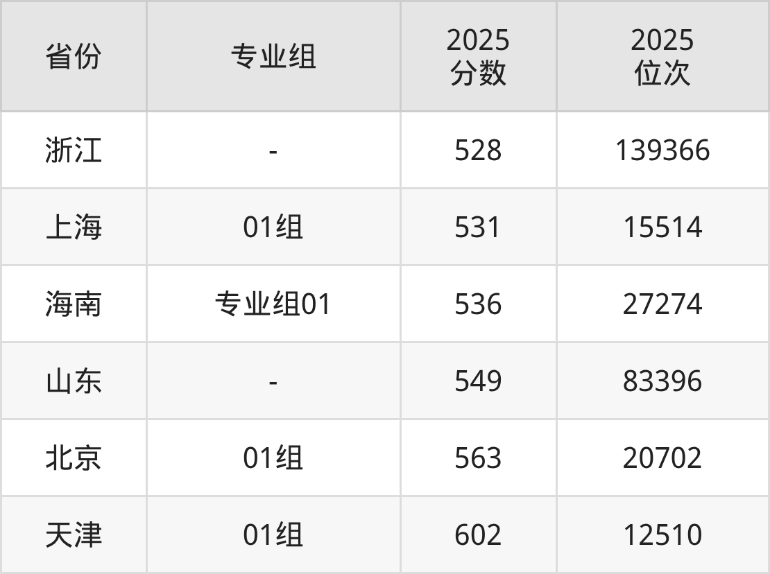最低分对应地区为浙江,录取位次为139366,超一段线46分;最高分对应地区为天津(01组),录取位次为12510,超本科线126分。