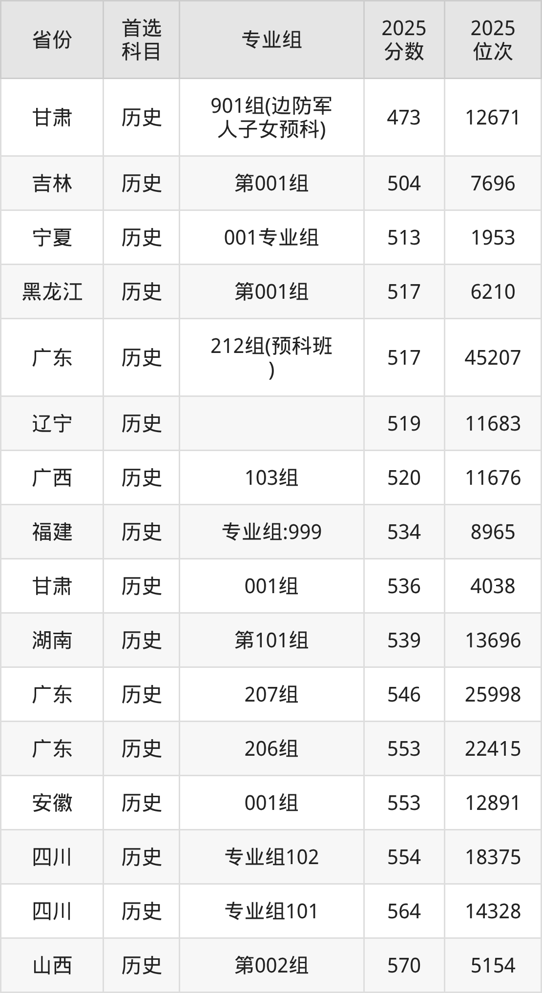 历史类最低分对应地区为甘肃(901组(边防军人子女预科)),录取位次为12671,超本科线61分;最高分对应地区为贵州,录取位次为4328。