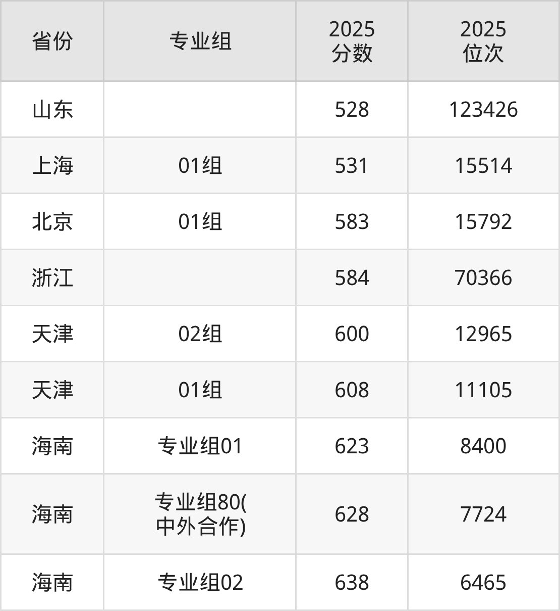 最低分对应地区为山东,录取位次为123426,超一段线87分;最高分对应地区为海南(专业组02),录取位次为6465,超本科线158分。