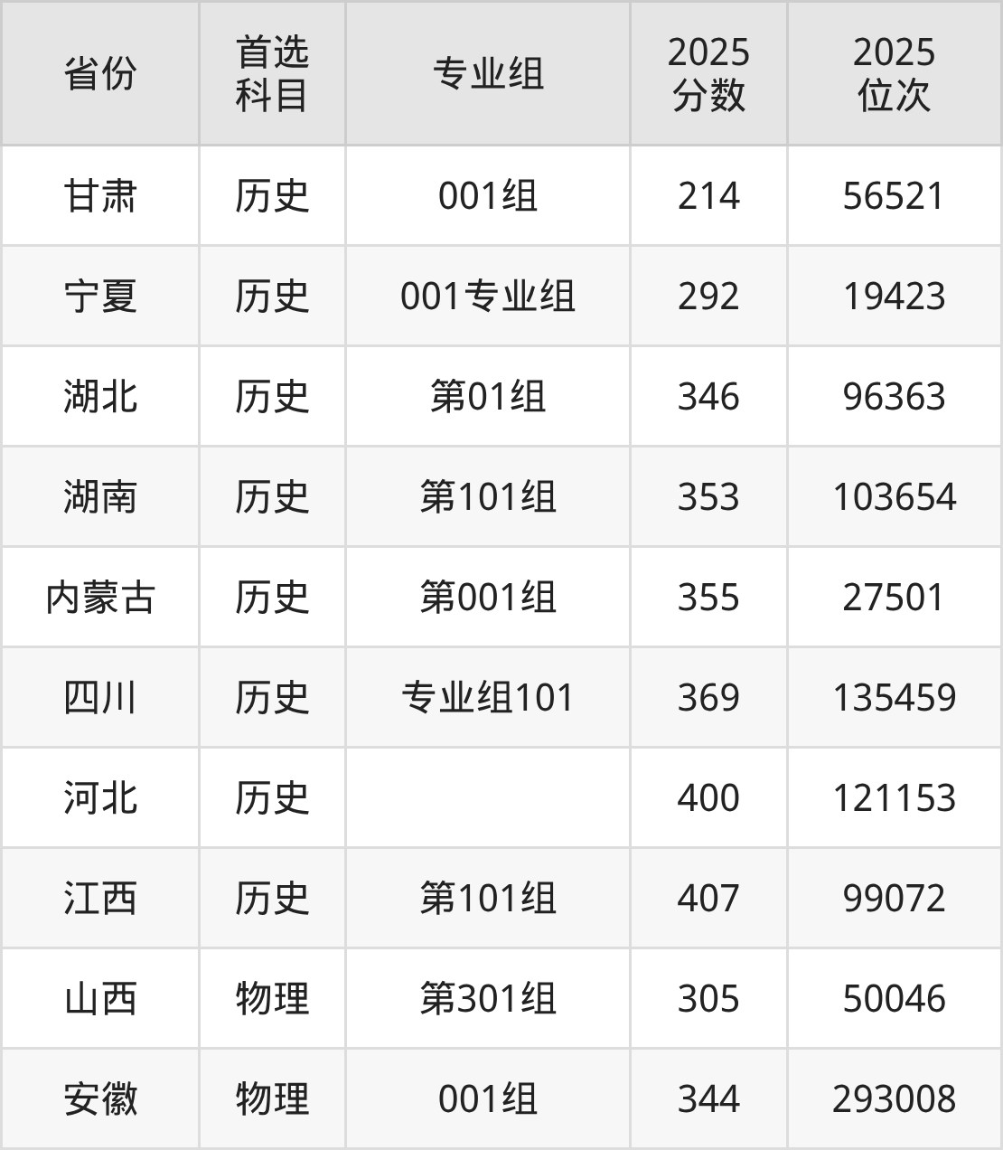历史类最低分对应地区为甘肃(001组),录取位次为56521,超专科线54分;最高分对应地区为江西(第101组),录取位次为99072,超专科线117分。